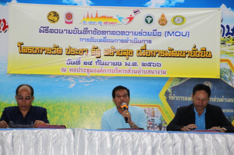 รายละเอียด : องค์การบริหารส่วนตำบลนางาม ได้จัดพิธีลงนามบันทึกข้อตกลงความร่วมมือ (MOU) การขับเคลื่อนการดำเนินการ โครงการ รัฐ ประชา สร้างสุข เพื่อการพัฒนายั่งยืน วัตถุประสงค์เพื่อพัฒนารูปแบบและนำแนวคิด (5 ส). ลงสู่บริบทของวัดและชุมชน ส่งเสริมให้วัดเป็นพื้นที่ต้นแบบของการพัฒนาด้วนกายภาพการเรียนรู้จิตใจและปัญญาโดยบูรณาการแนวคิด (5 ส) ณ หอประชุมองค์การบริหารส่วนตำบลนางาม