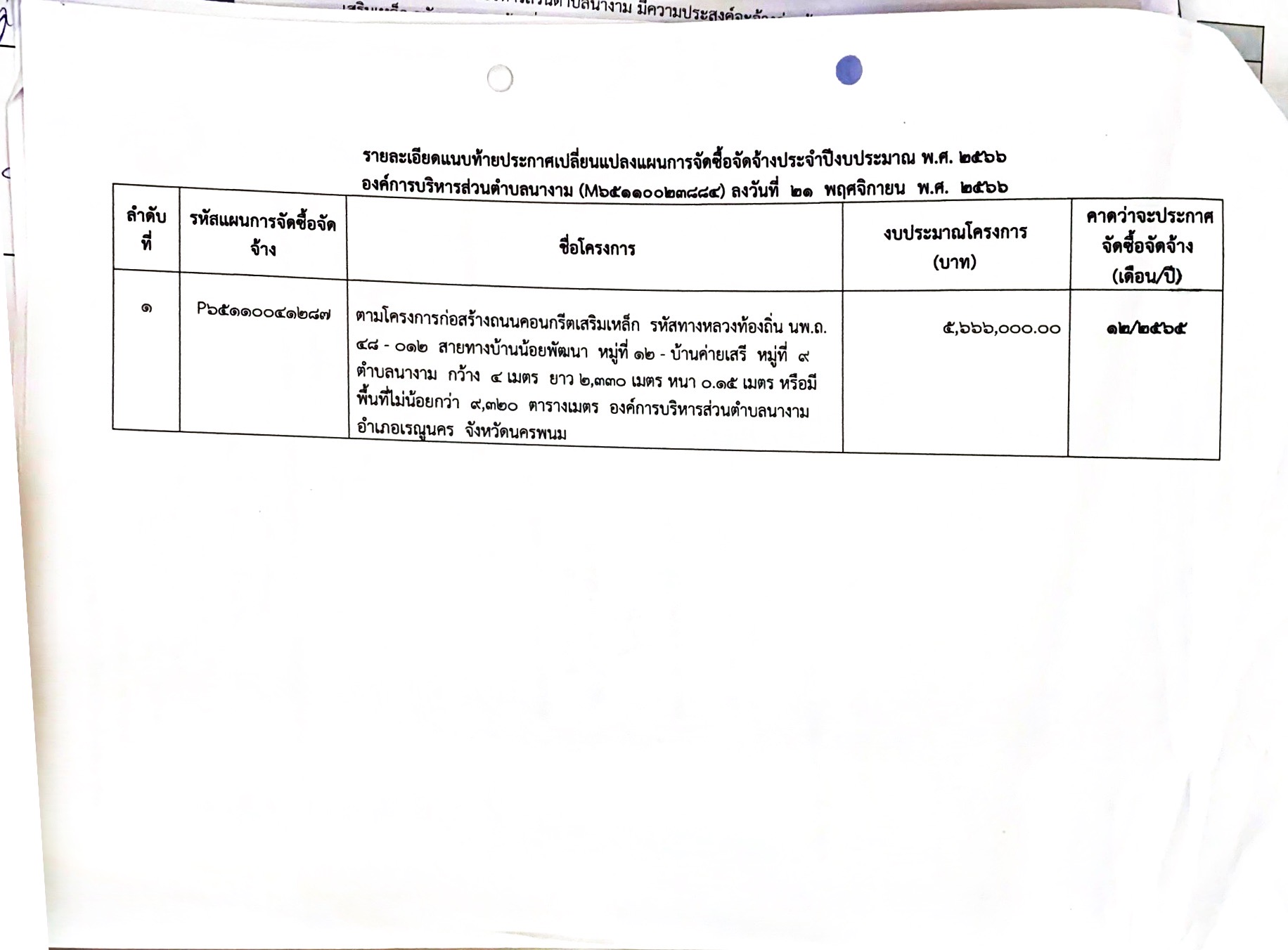 ชื่อเรื่อง : ประกาศแผนการจัดซื้อจัดจ้าง ประจำปีงบประมาณ พ.ศ. 2566 ตามโครงการก่อสร้างถนนคอนกรีตเสริมเหล็ก รหัสทางหลวงท้องถิ่น นพ.ถ. ๔๘ - ๐๑๒ สายทางบ้านน้อยพัฒนา หมู่ที่ ๑๒ - บ้านค่ายเสรี หมู่ที่ ๙ ตำบลนางาม กว้าง ๔ เมตร ยาว ๒,๓๓๐ เมตร หนา ๐.๑๕ เมตร
