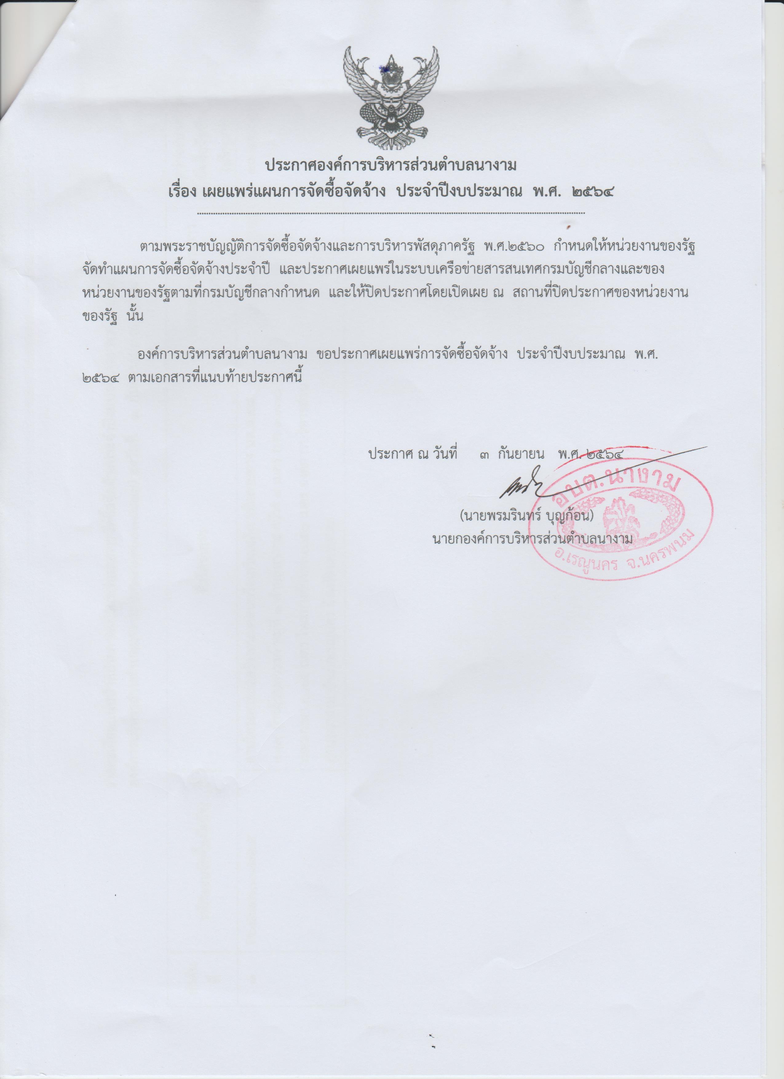 ประกาศเผยแพร่แผนการจัดซื้อจัดจ้าง ประจำปีงบประมาณ พ.ศ. 2564