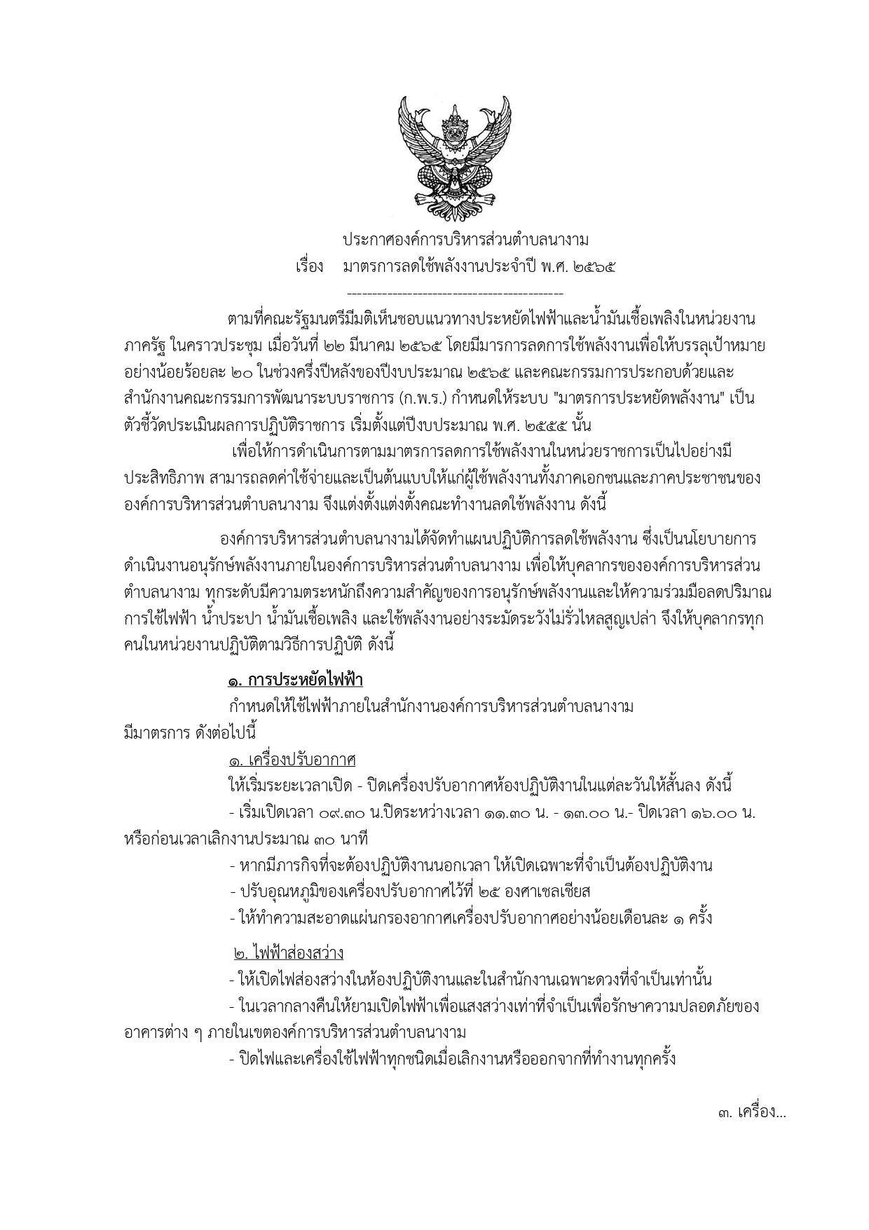 ชื่อเรื่อง : ประกาศองค์การบริหารส่วนตำบลนางาม เรื่อง มาตรการลดใช้พลังงานประจำปี พ.ศ. 2565