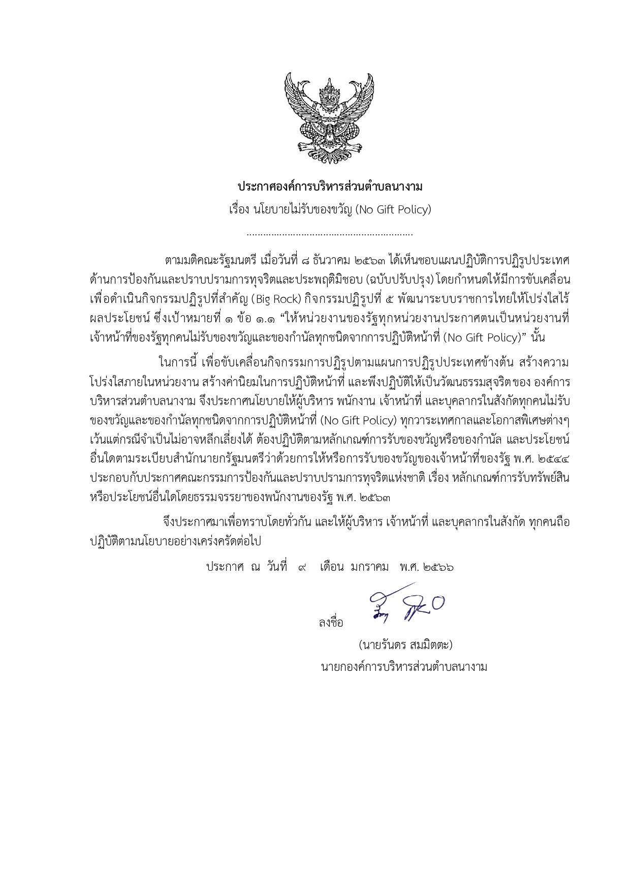 ประกาศนโยบายไม่รับของขวัญ NO GIFT POLICY ประจำปี พ.ศ. 2566