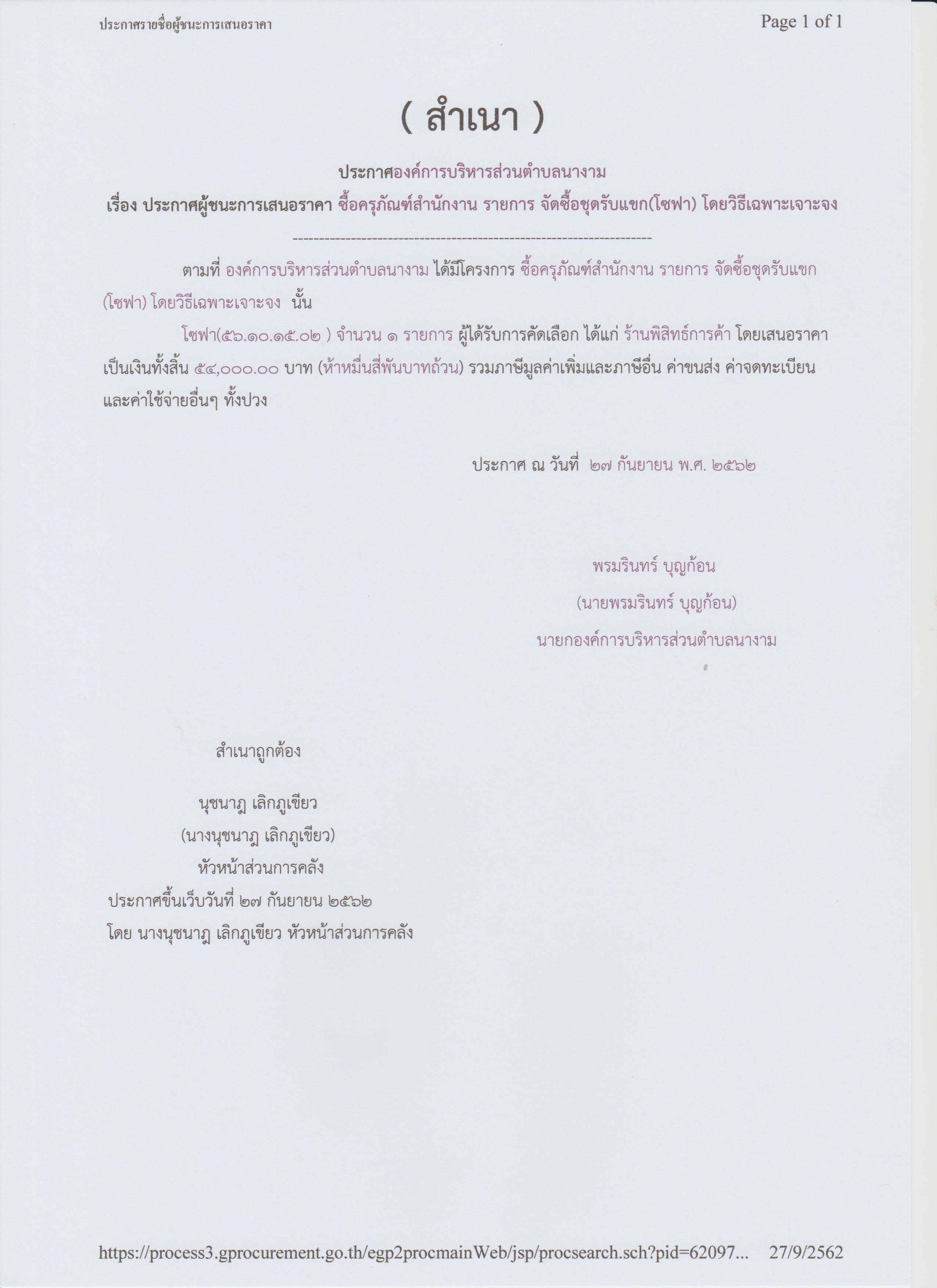 ประกาศผู้ชนะการเสนอราคา ซื้อครุภัณฑ์สำนักงาน รายการ จัดซื้อชุดรับแขก(โซฟา) โดยวิธีเฉพาะเจาะจง