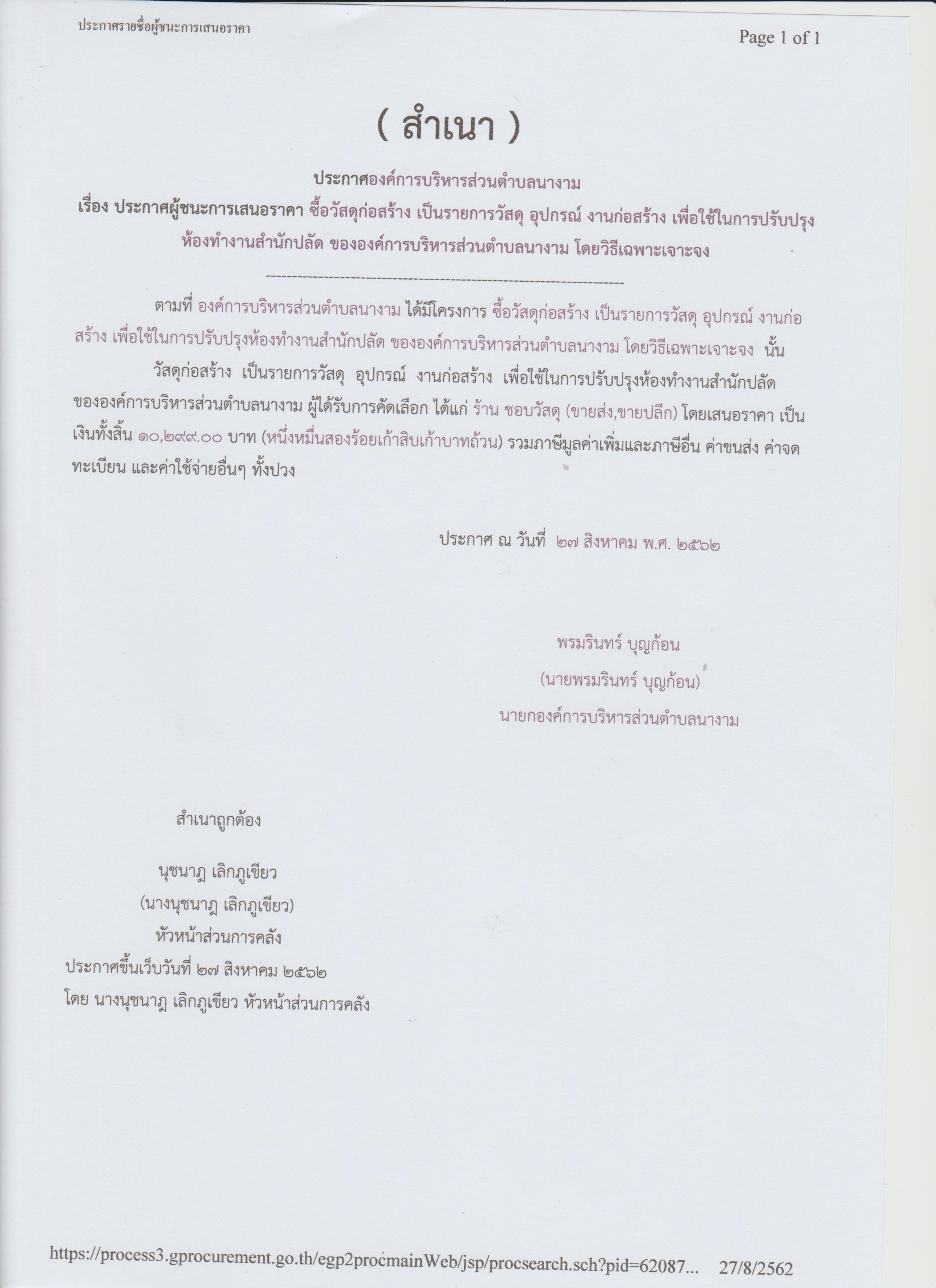 ชื่อเรื่อง : ประกาศผู้ชนะการเสนอราคา ซื้อวัสดุก่อสร้าง เป็นรายการวัสดุ อุปกรณ์ งานก่อสร้าง เพื่อใช้ในการปรับปรุงห้องทำงานสำนักปลัด ขององค์การบริหารส่วนตำบลนางาม โดยวิธีเฉพาะเจาะจง