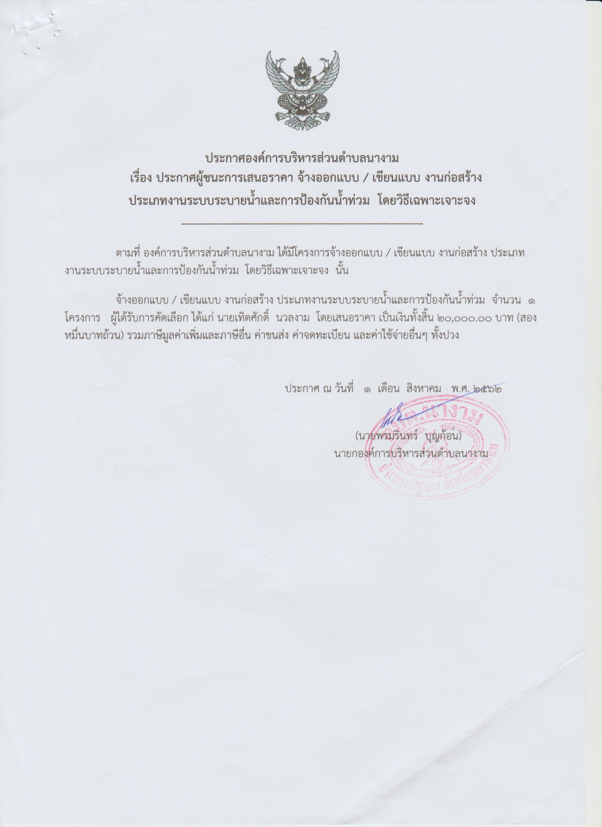 ชื่อเรื่อง : เรื่อง ประกาศผู้ชนะการเสนอราคา จ้างออกแบบ / เขียนแบบ งานก่อสร้าง ประเภทงานระบบระบายน้ำและการป้องกันน้ำท่วม โดยวิธีเฉพาะเจาะจง