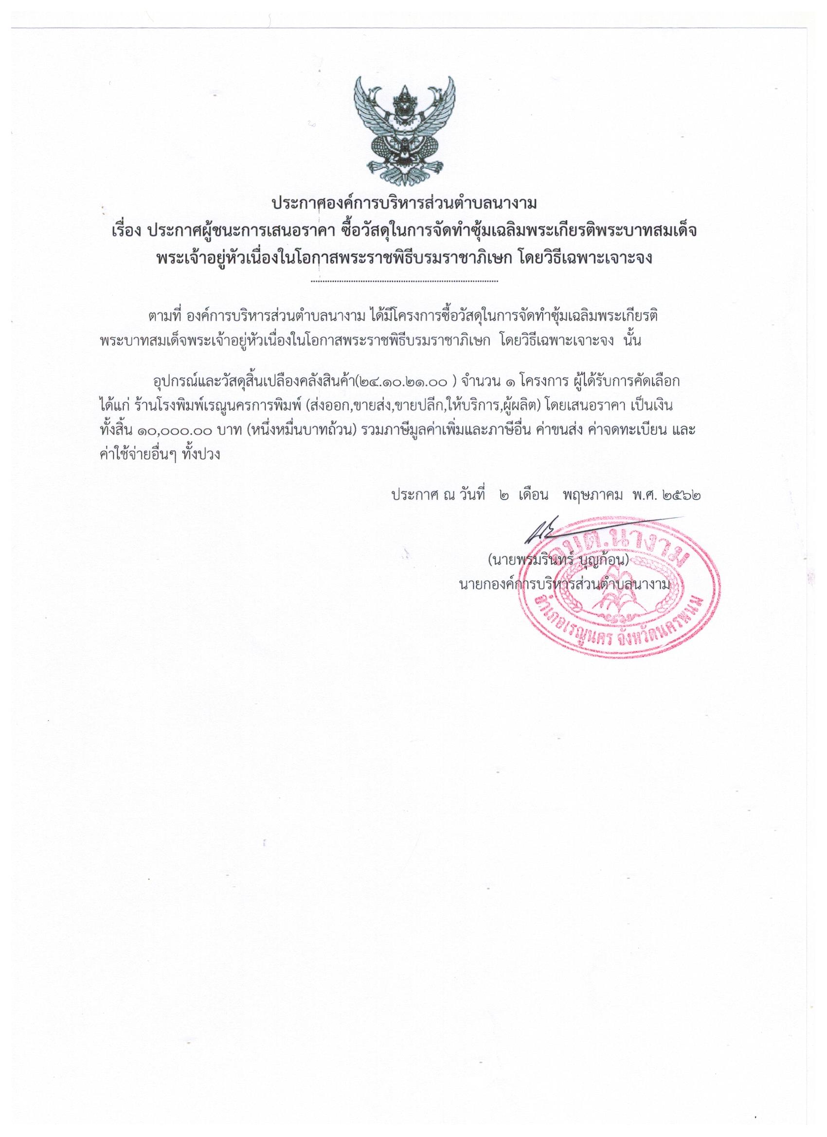 ประกาศผู้ชนะการเสนอราคา ซื้อวัสดุในการจัดทำซุ้มเฉลิมพระเกียรติพระบาทสมเด็จ พระเจ้าอยู่หัวเนื่องในโอกาสพระราชพิธีบรมราชาภิเษก โดยวิธีเฉพาะเจาะจง