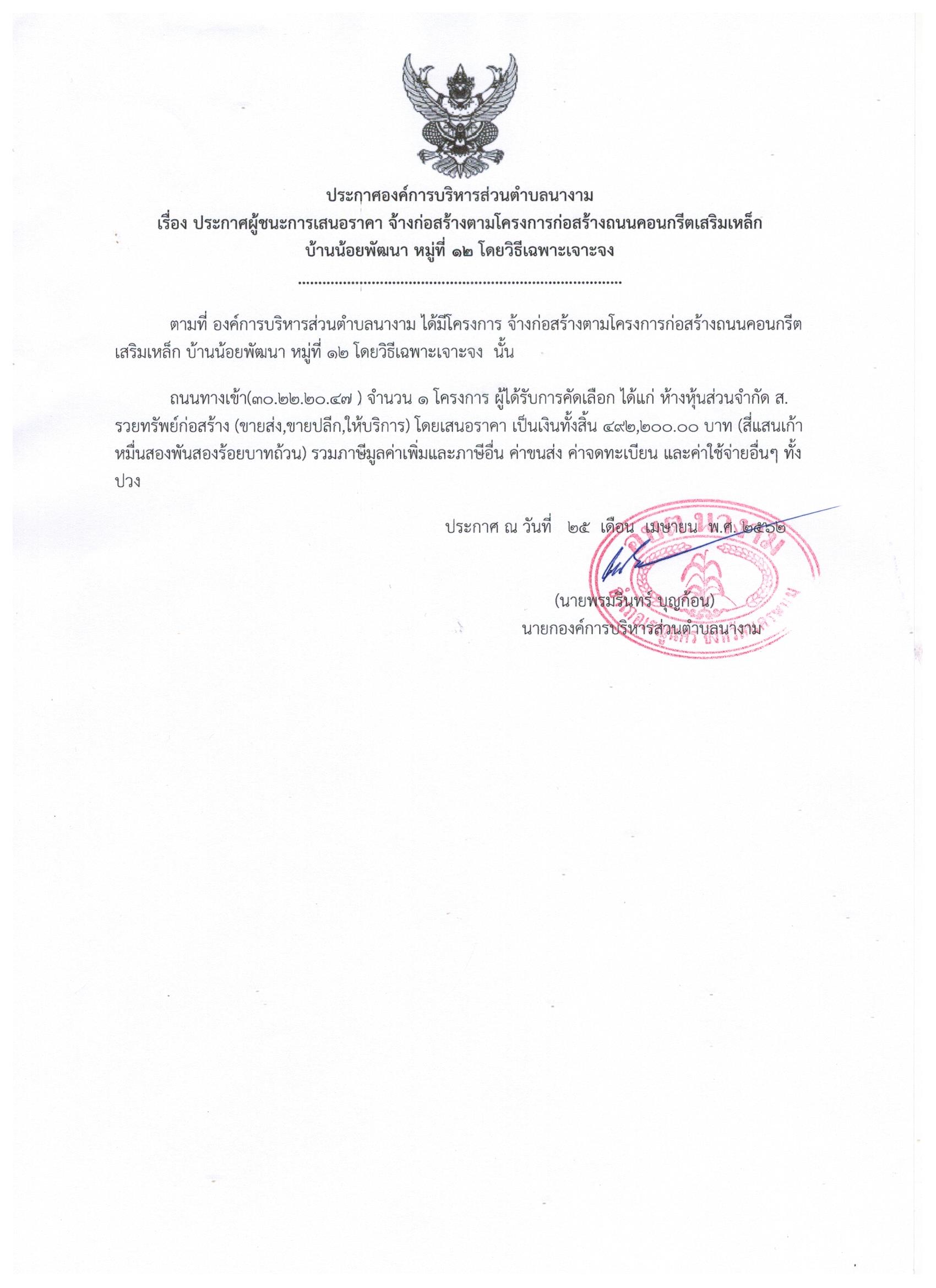 ประกาศผู้ชนะการเสนอราคาจ้างตามโครงการก่อสร้างถนนคอนกรีตเสริมเหล็ก บ้านน้อยพัฒนา หมู่ที่ ๑๒ โดยวิธีเฉพาะเจาะจง
