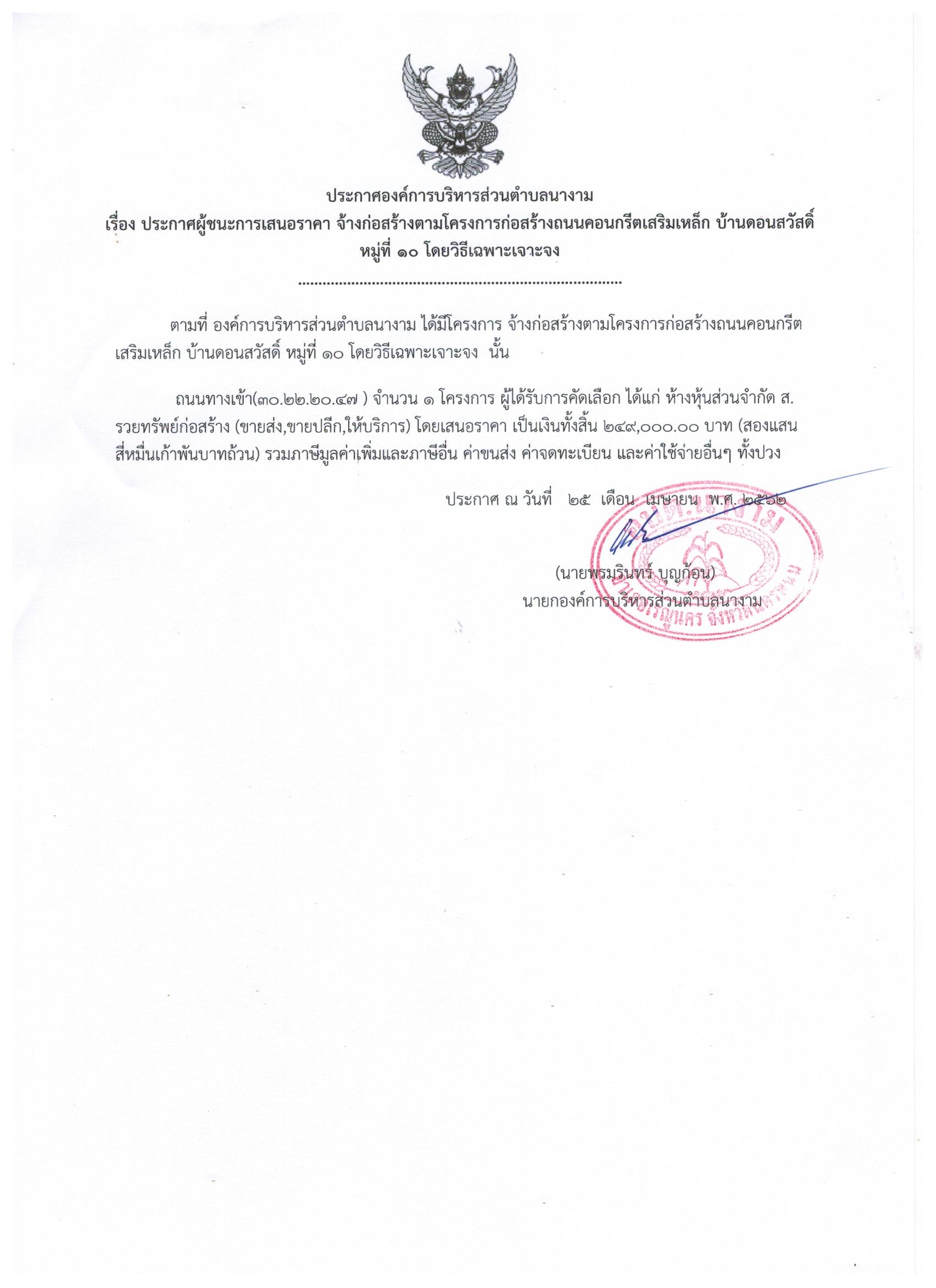 ชื่อเรื่อง : ประกาศผู้ชนะการเสนอราคาจ้างตามโครงการก่อสร้างถนนคอนกรีตเสริมเหล็ก บ้านดอนสวัสดิ์ หมู่ที่ ๑๐ โดยวิธีเฉพาะเจาะจง