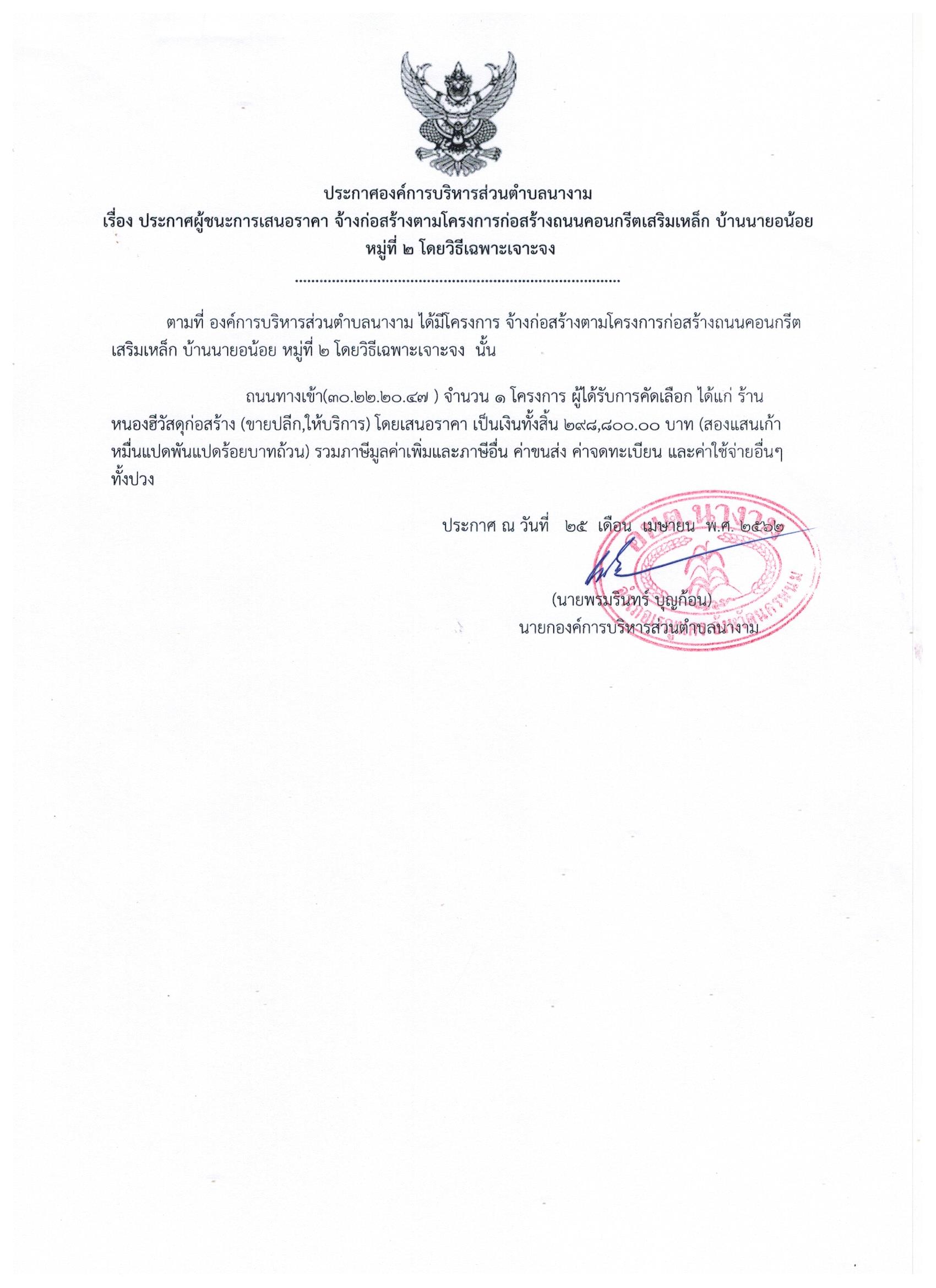 ประกาศผู้ชนะการเสนอราคาจ้างตามโครงการก่อสร้างถนนคอนกรีตเสริมเหล็ก บ้านนายอน้อย หมู่ที่ ๒ โดยวิธีเฉพาะจาะจง