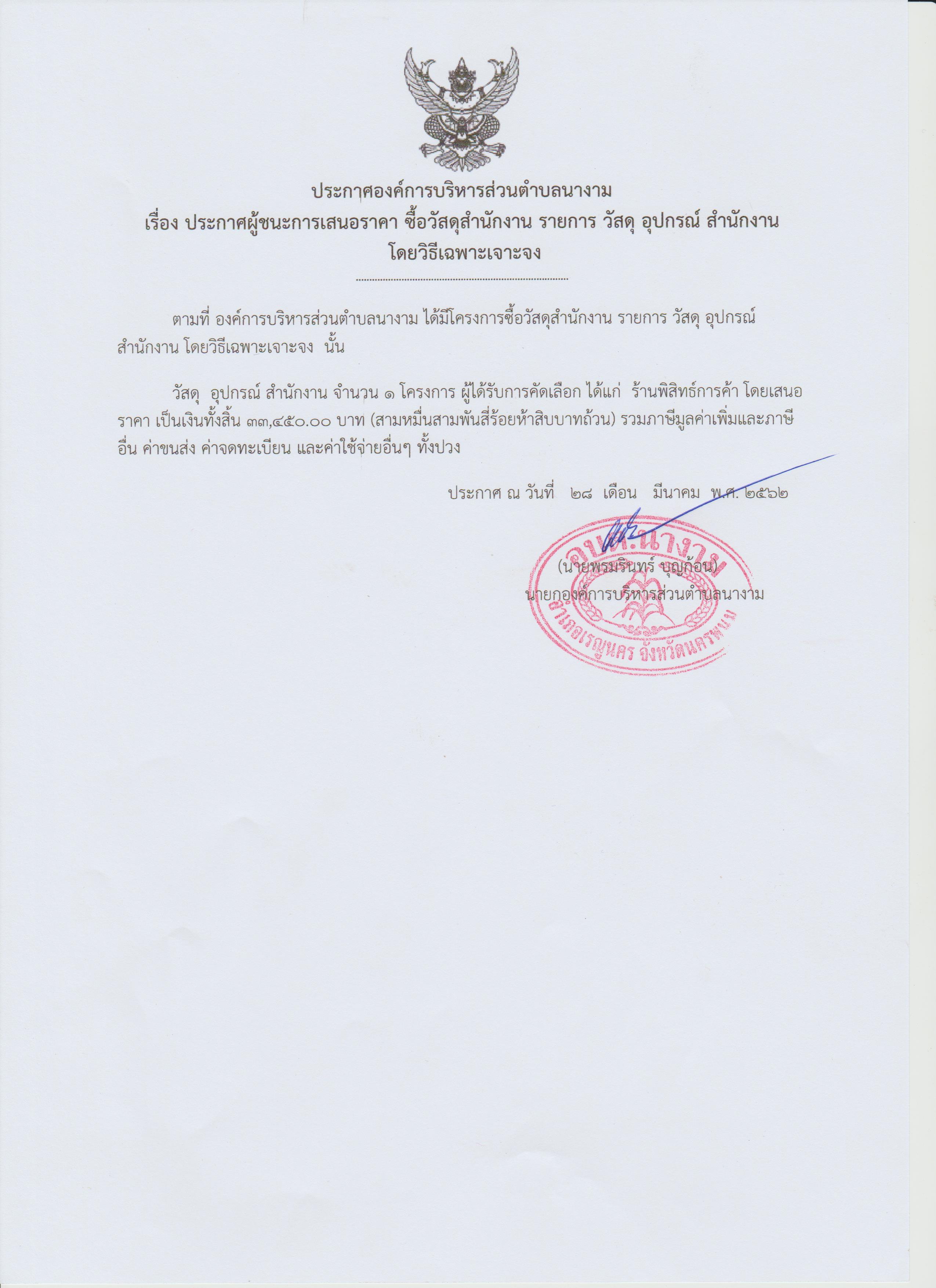 ชื่อเรื่อง : ประกาศผู้ชนะการเสนอราคาการจัดซื้อวัสดุสำนักงาน รายการ วัสดุ อุปกรณ์ สำนักงาน โดยวิธีเฉพาะเจาะจง