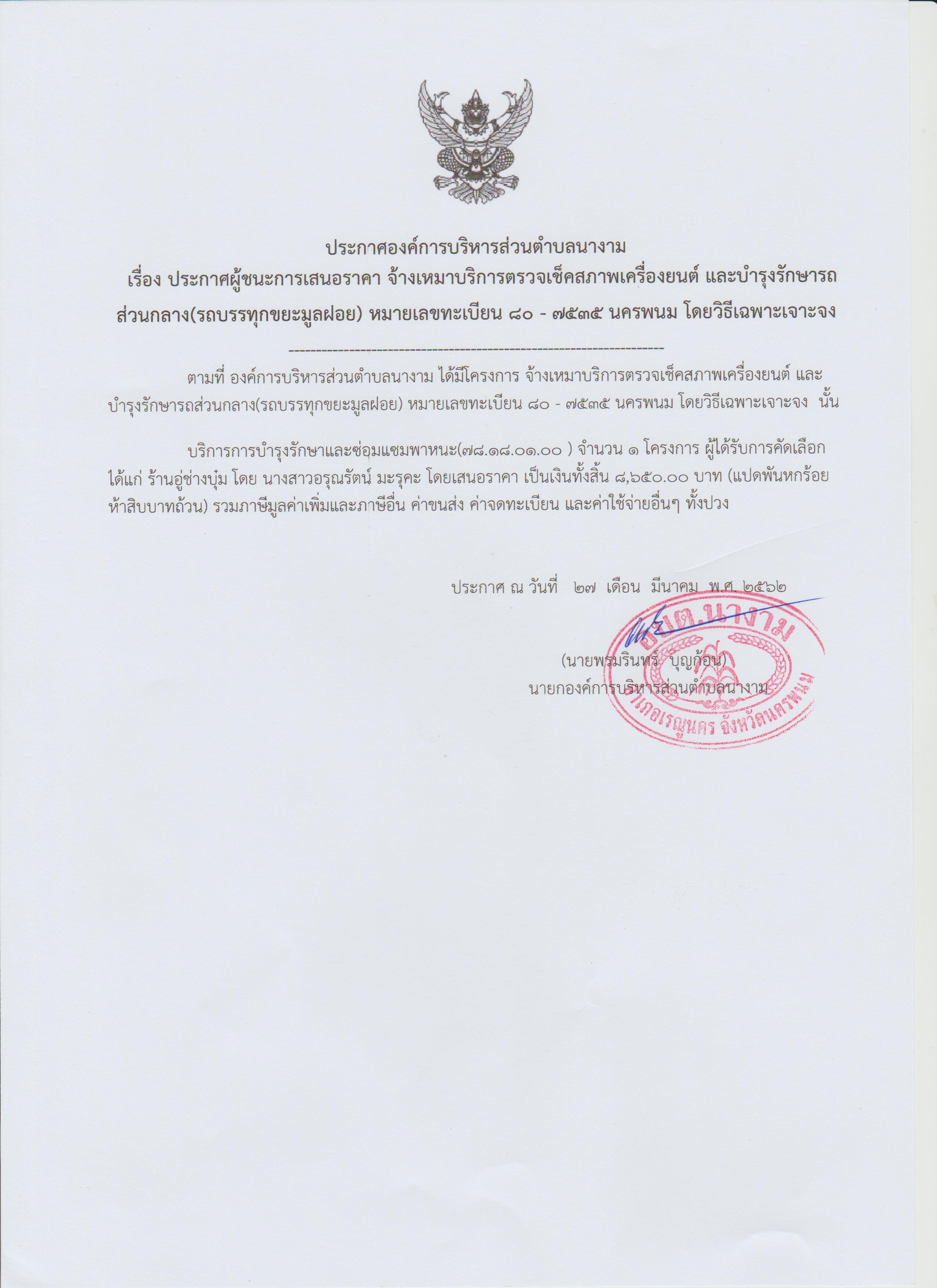 ประกาศผู้ชนะการเสนอราคา จ้างเหมาบริการตรวจเช็คสภาพเครื่องยนต์ และบำรุงรักษารถส่วนกลาง(รถบรรทุกขยะมูลฝอย) หมายเลขทะเบียน ๘๐ - ๗๕๓๕ นครพนม โดยวิธีเฉพาะเจาะจง