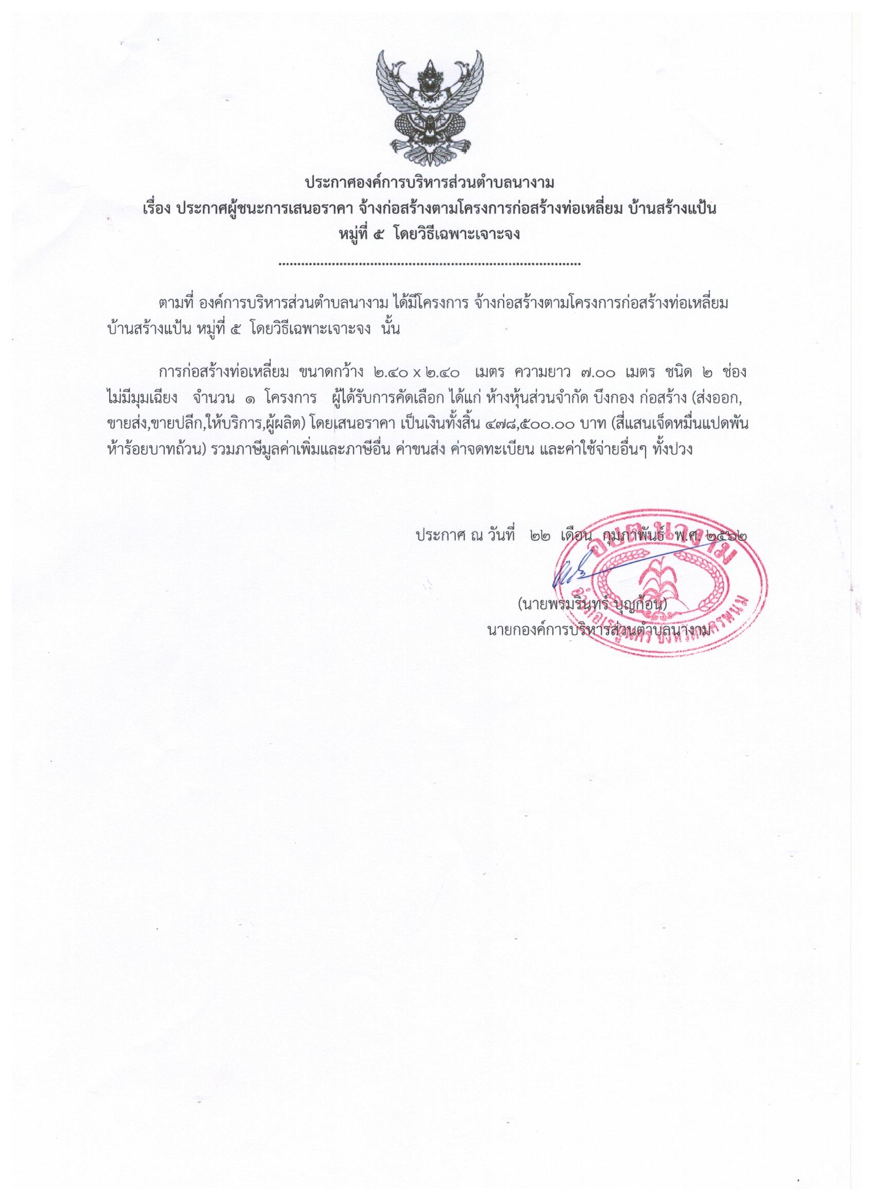 ประกาศผู้ชนะการเสนอราคาตามโครงการก่อสร้างท่อเหลี่ยม บ้านสร้างแป้น หมู่ที่ 5