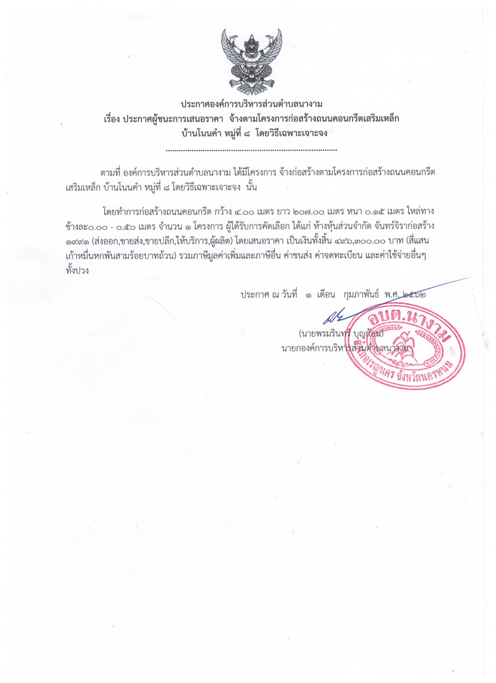 ประกาศผู้ชนะการเสนอราคาตามโครงการก่อสร้างถนนคอนกรีตเสริมเหล็ก บ้านโนนคำ หมู่ที่ 8