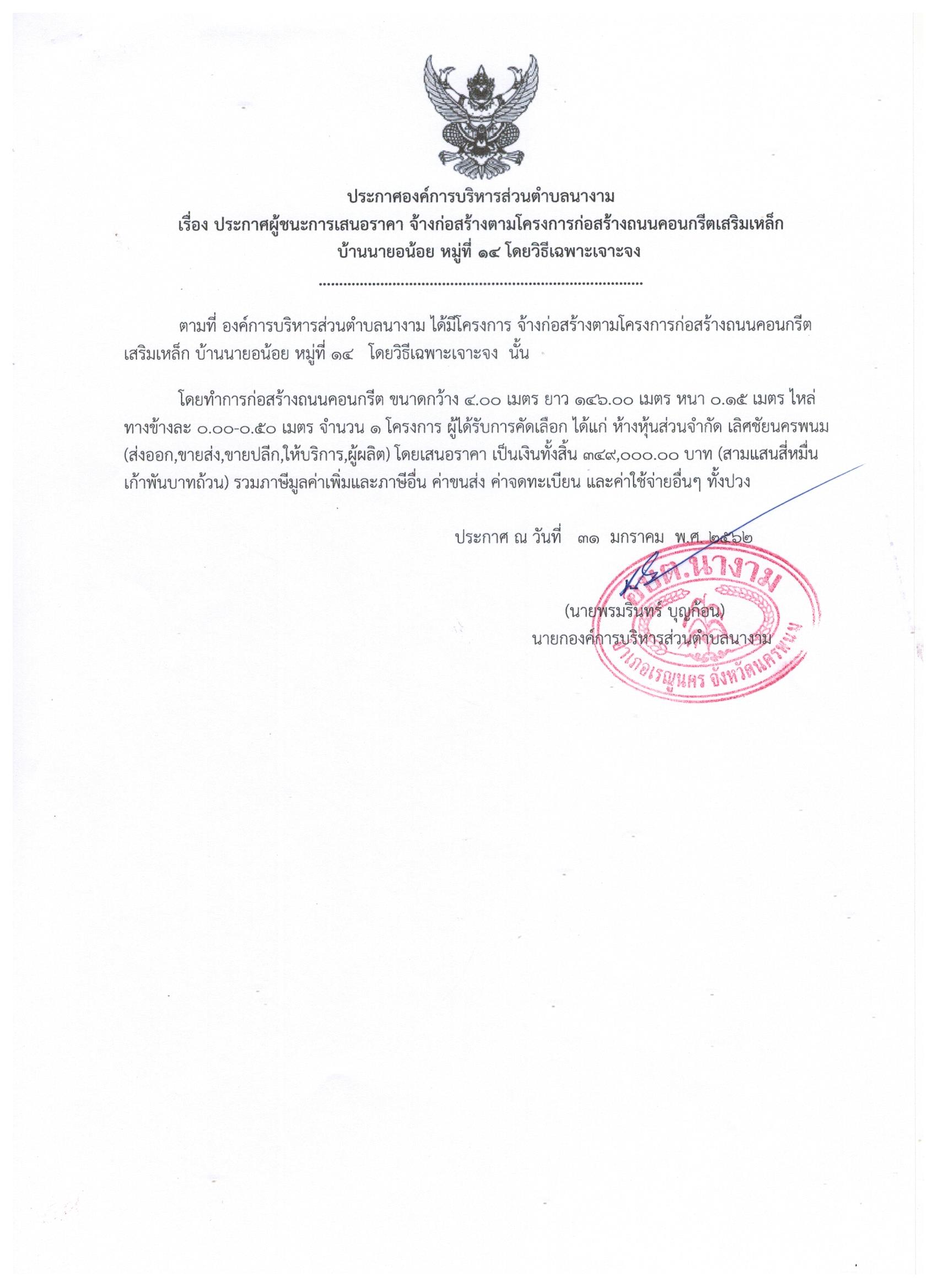 ชื่อเรื่อง : ประกาศผู้ชนะการเสนอราคาตามโครงการก่อสร้างถนนคอนกรีตเสริมเหล็ก บ้านนายอน้อย หมู่ที่ 14
