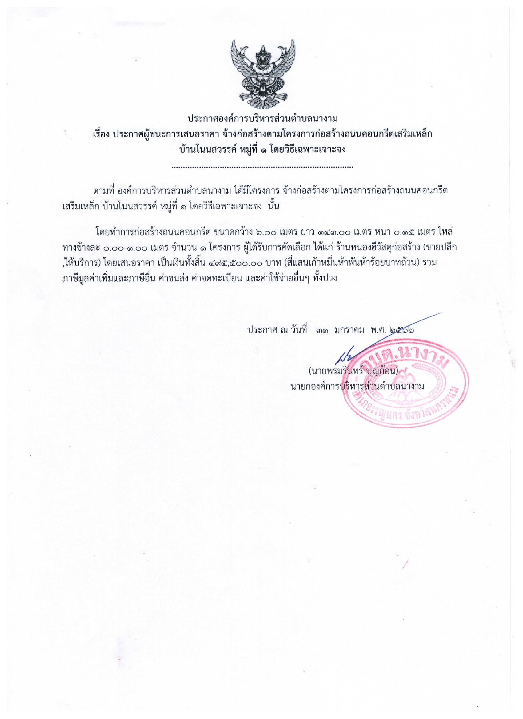 ชื่อเรื่อง : ประกาศผู้ชนะการเสนอราคาตามโครงการก่อสร้างถนนคอนกรีตเสริมเหล็ก บ้านโนนสวรรค์ หมู่ที่ 1