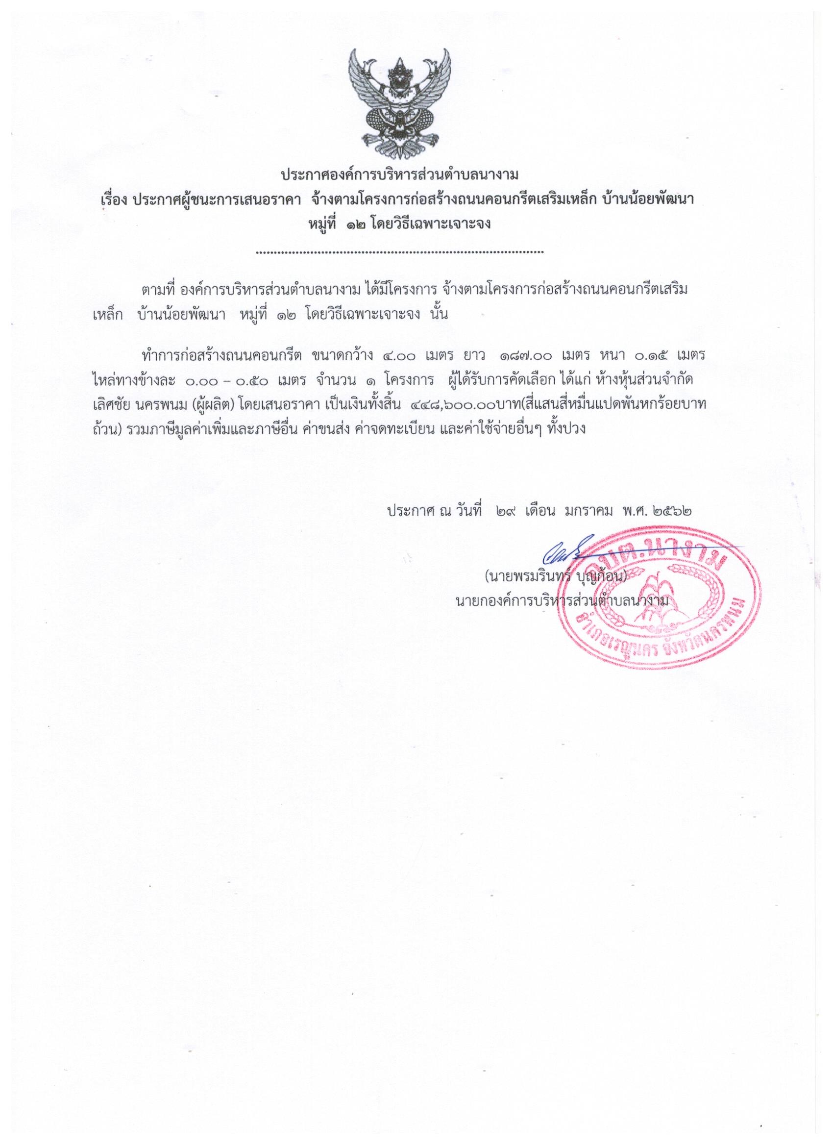 ชื่อเรื่อง : ประกาศผู้ชนะการเสนอราคาตามโครงการก่อสร้างถนนคอนกรีตเสริมเหล็ก บ้านน้อยพัฒนา หมู่ที่ 12