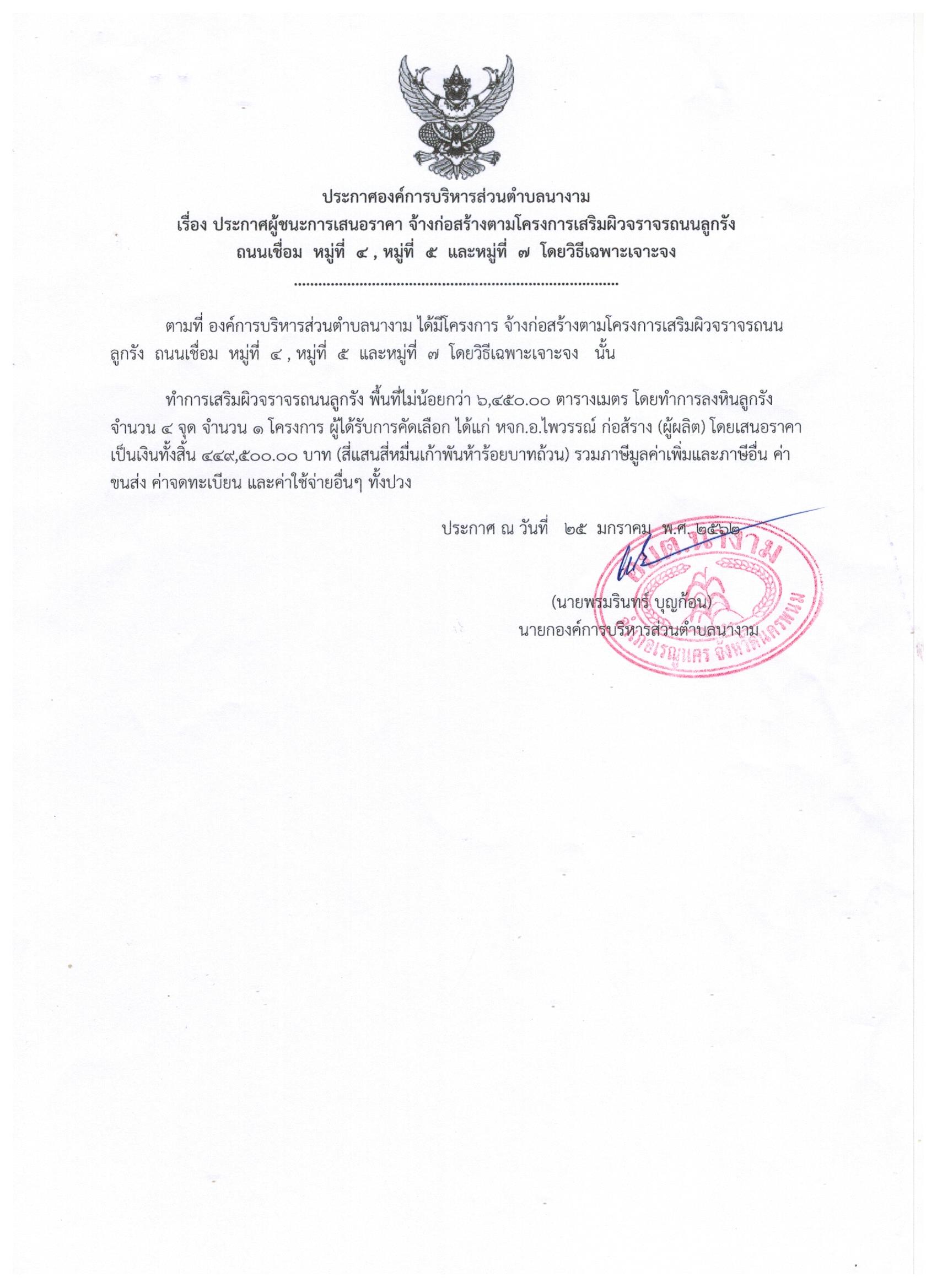 ประกาศผู้ชนะการเสนอราคาตามโครงการเสริมผิวจราจรถนนลูกรัง ถนนเชื่อม หมู่ที่ 4 , หมู่ที่ 5 และหมู่ที่ 7