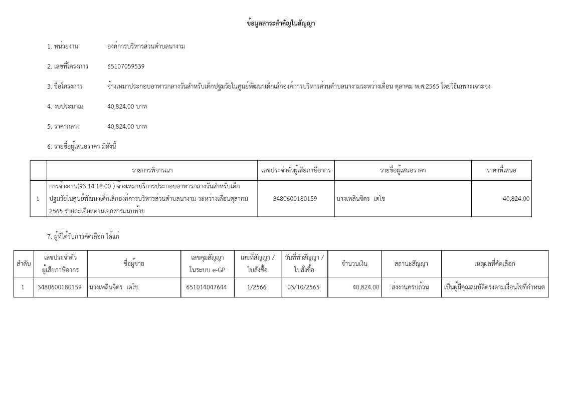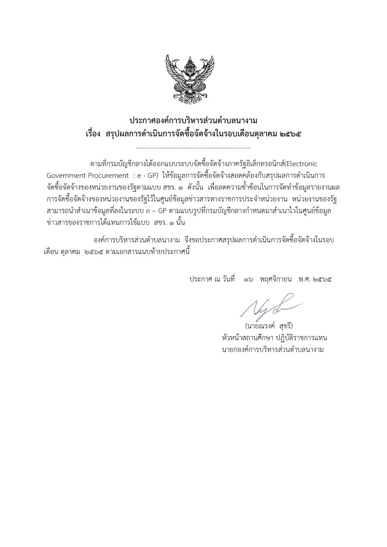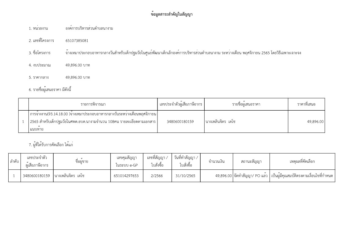สรุปผลการดำเนินการจัดซื้อจัดจ้างศูนย์พัฒนาเด็กเล็กองค์การบริหารส่วนตำบลนางามเดือน ตุลาคม 2565