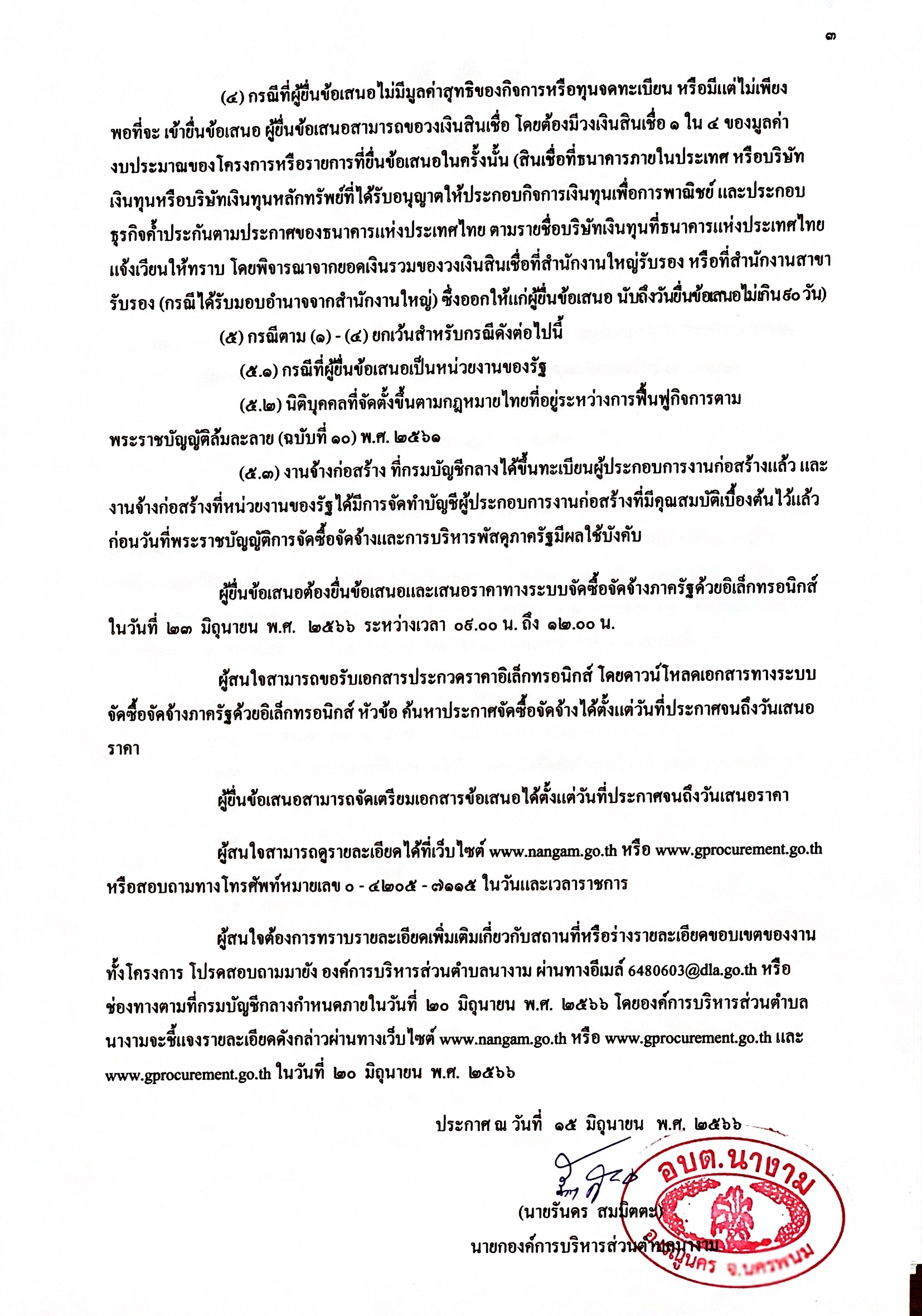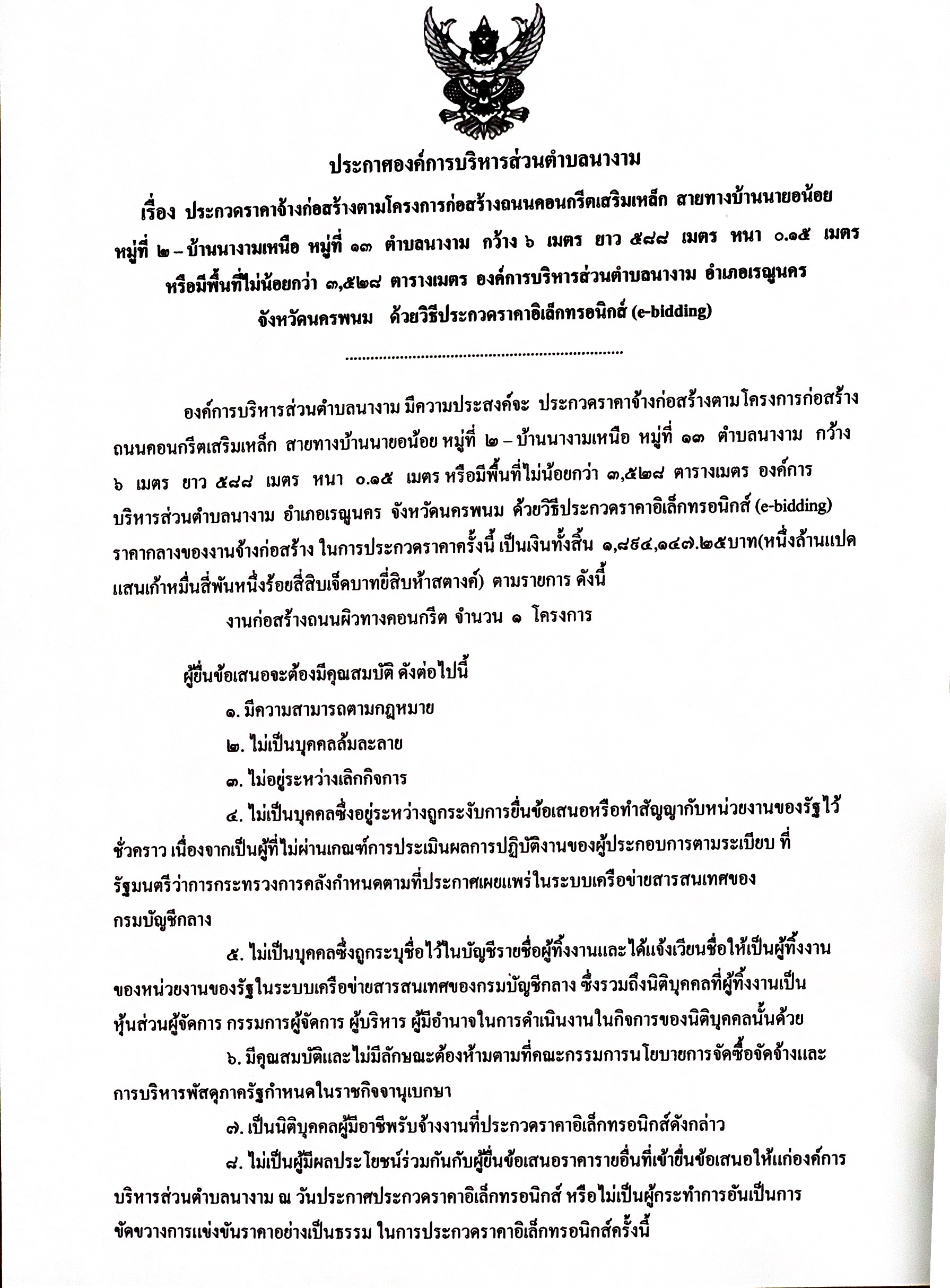 ชื่อเรื่อง : ประกาศประกวดราคาจ้างก่อสร้างตามโครงการก่อสร้างถนนคอนกรีตเสริมเหล็ก สายทางบ้านนายอน้อย หมู่ที่ ๒ - บ้านนางามเหนือ หมู่ที่ ๑๓ ตำบลนางาม กว้าง ๖ เมตร ยาว ๕๘๘ เมตร หนา ๐.๑๕ เมตร หรือมีพื้นที่ไม่ น้อยกว่า ๓,๕๒๘ ตารางเมตร องค์การบริหารส่วนตำบลนางาม อำเภอเรณูนคร