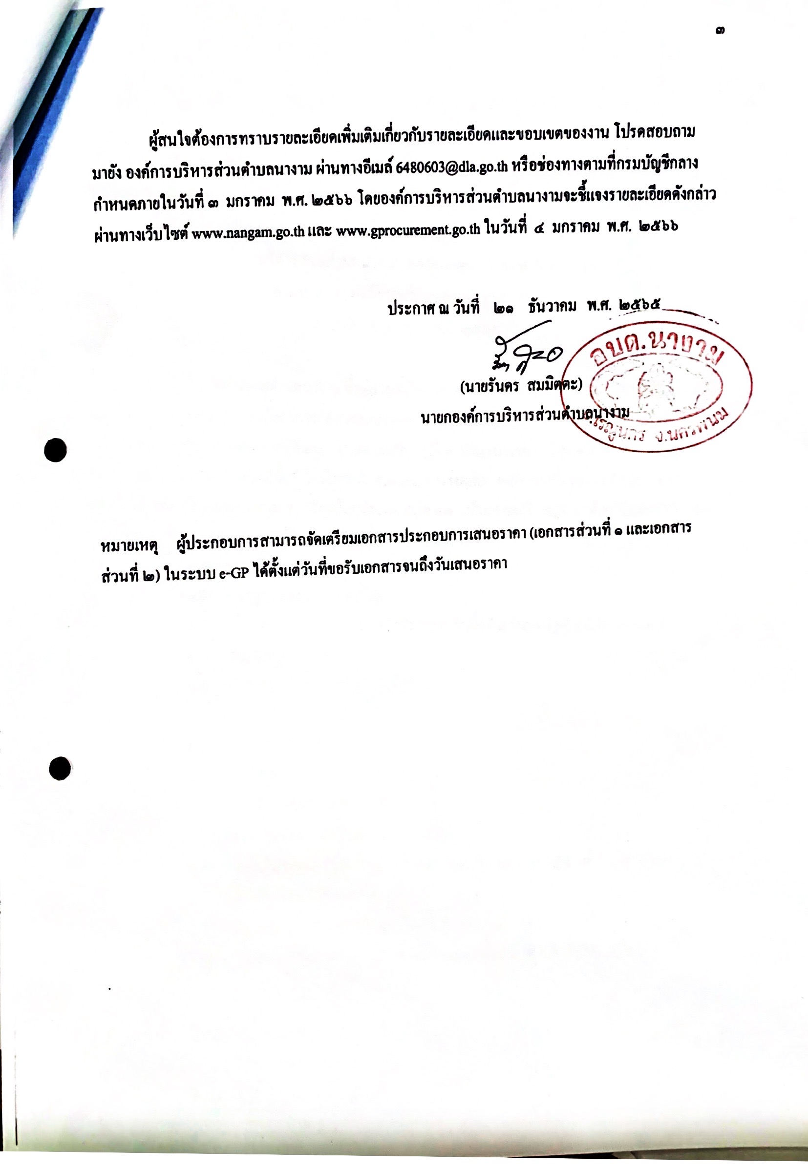 ชื่อเรื่อง : ประกาศประกวดราคาจ้างก่อสร้างตามโครงการก่อสร้างถนนคอนกรีตเสริมเหล็ก รหัสทางหลวงท้องถิ่น นพ.ถ. ๔๘ - ๐๑๒ สายทางบ้านน้อยพัฒนา หมู่ที่ ๑๒ - บ้านค่ายเสรี หมู่ที่ ๙ ตำบลนางาม กว้าง ๔ เมตร ยาว ๒,๓๓๐ เมตร หนา ๐.๑๕ เมตร หรือมีพื้นที่ไม่น้อยกว่า ๙,๓๒