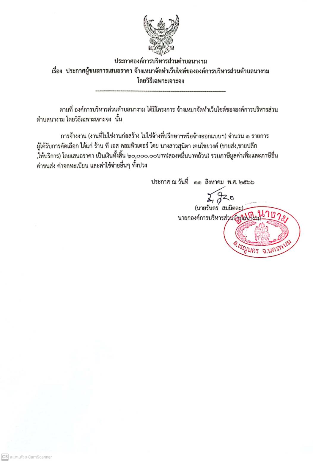 ประกาศผู้ชนะการเสนอราคา จ้างเหมาจัดทำเว็บไซต์ขององค์การบริหารส่วนตำบลนางาม โดยวิธีเฉพาะเจาะจง