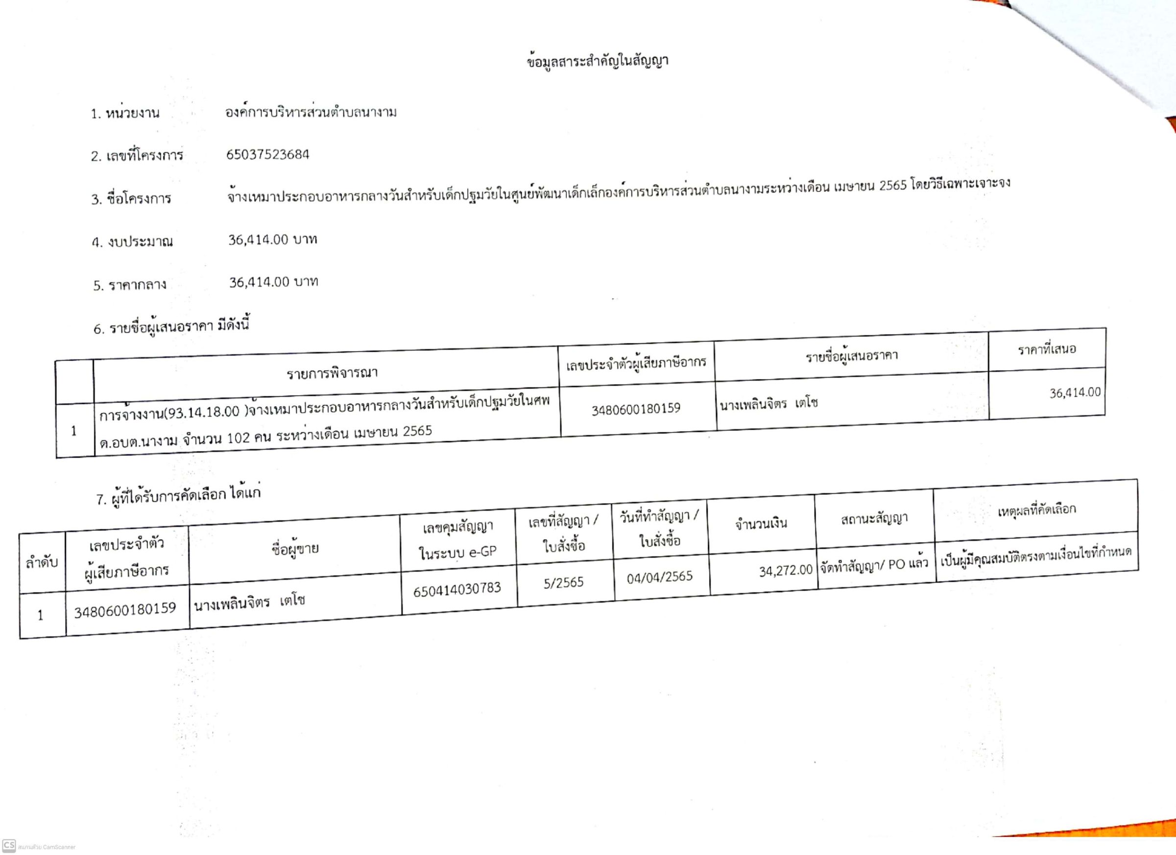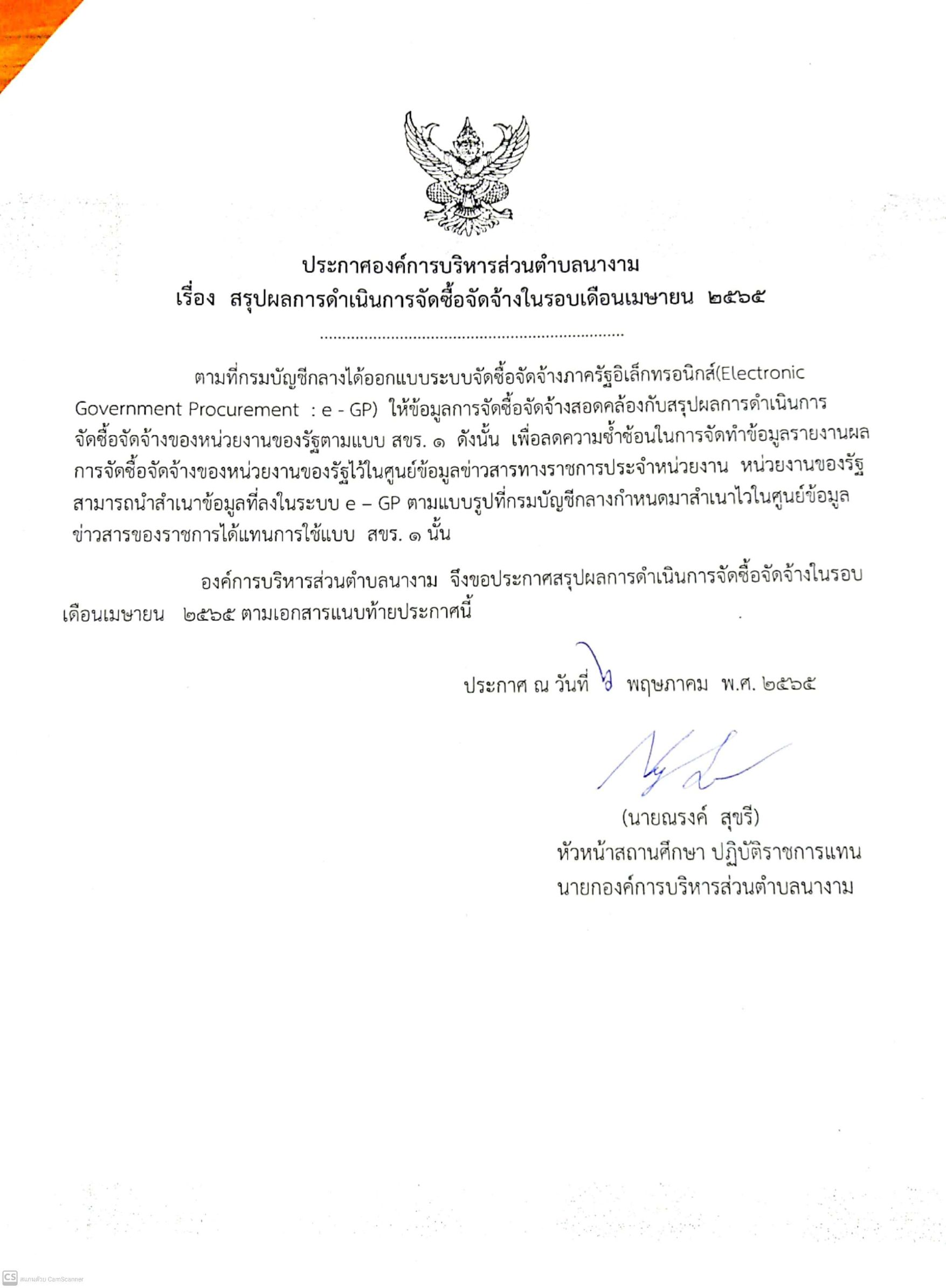 สรุปผลการดำเนินการจัดซื้อจัดจ้างศูนย์พัฒนาเด็กเล็กองค์การบริหารส่วนตำบลนางามเดือน เมษายน 2565