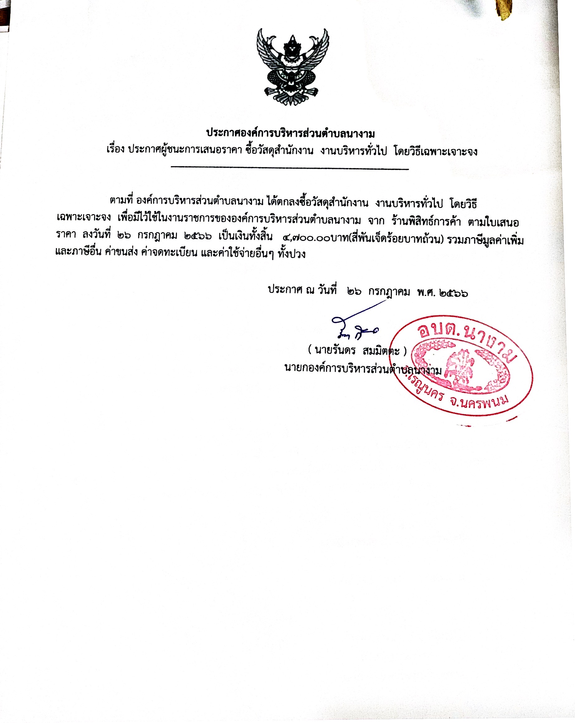 ประกาศผู้ชนะการเสนอราคา ซื้อวัสดุสำนักงาน งานบริหารทั่วไป โดยวิธีเฉพาะเจาะจง