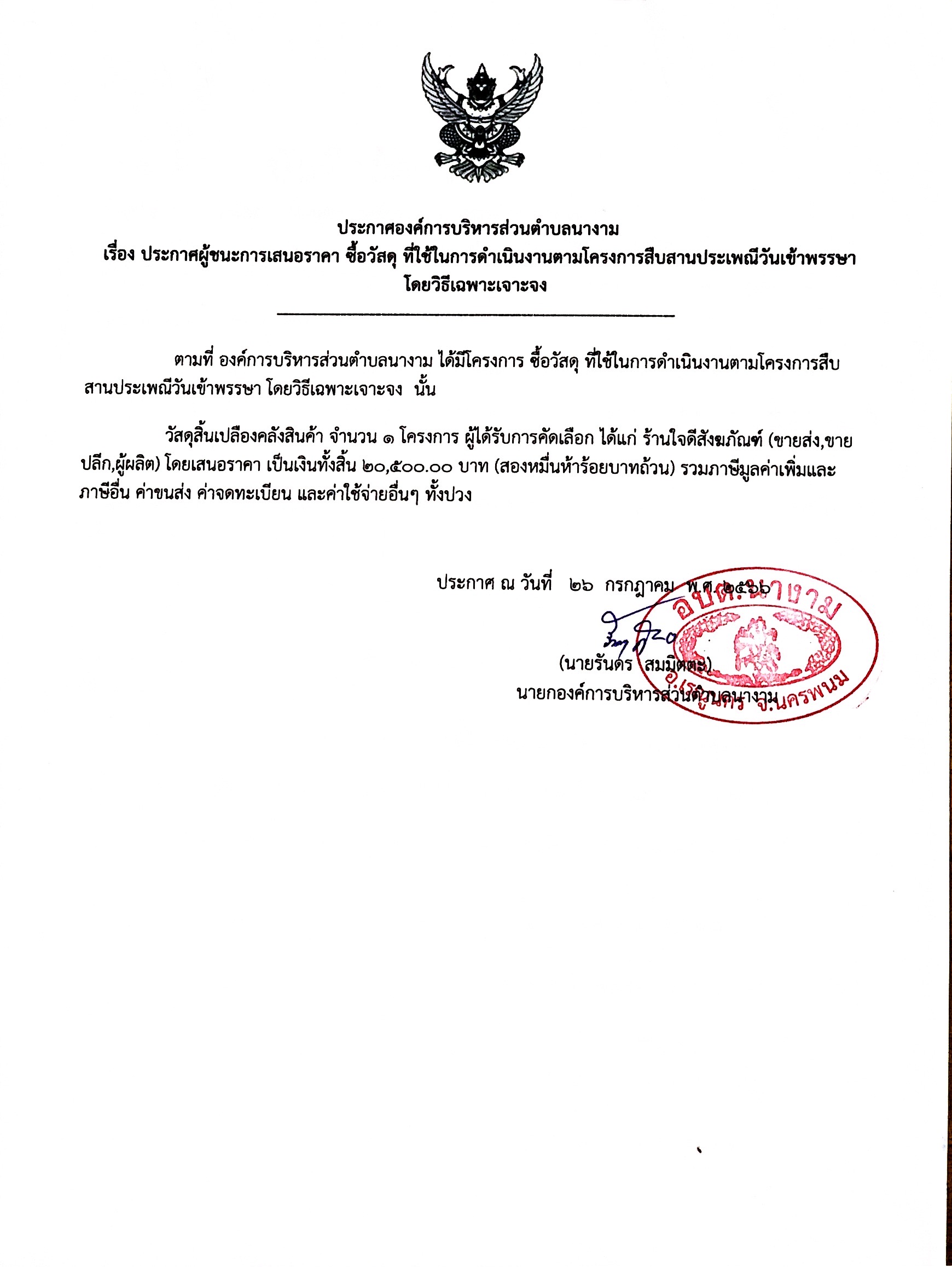 ประกาศผู้ชนะการเสนอราคา ซื้อวัสดุ ที่ใช้ในการดำเนินงานตามโครงการสืบสานประเพณีวันเข้าพรรษา โดยวิธีเฉพาะเจาะจง