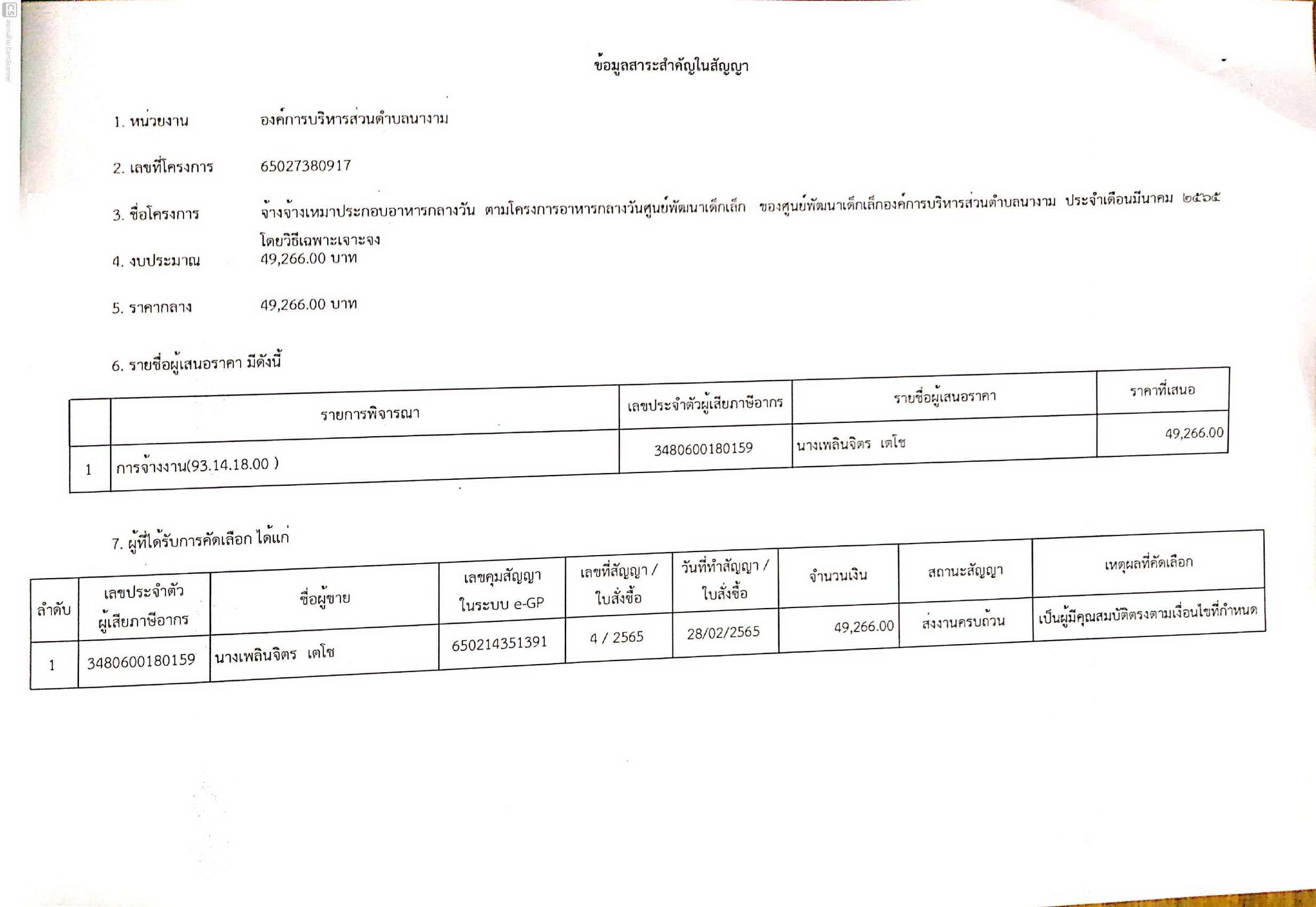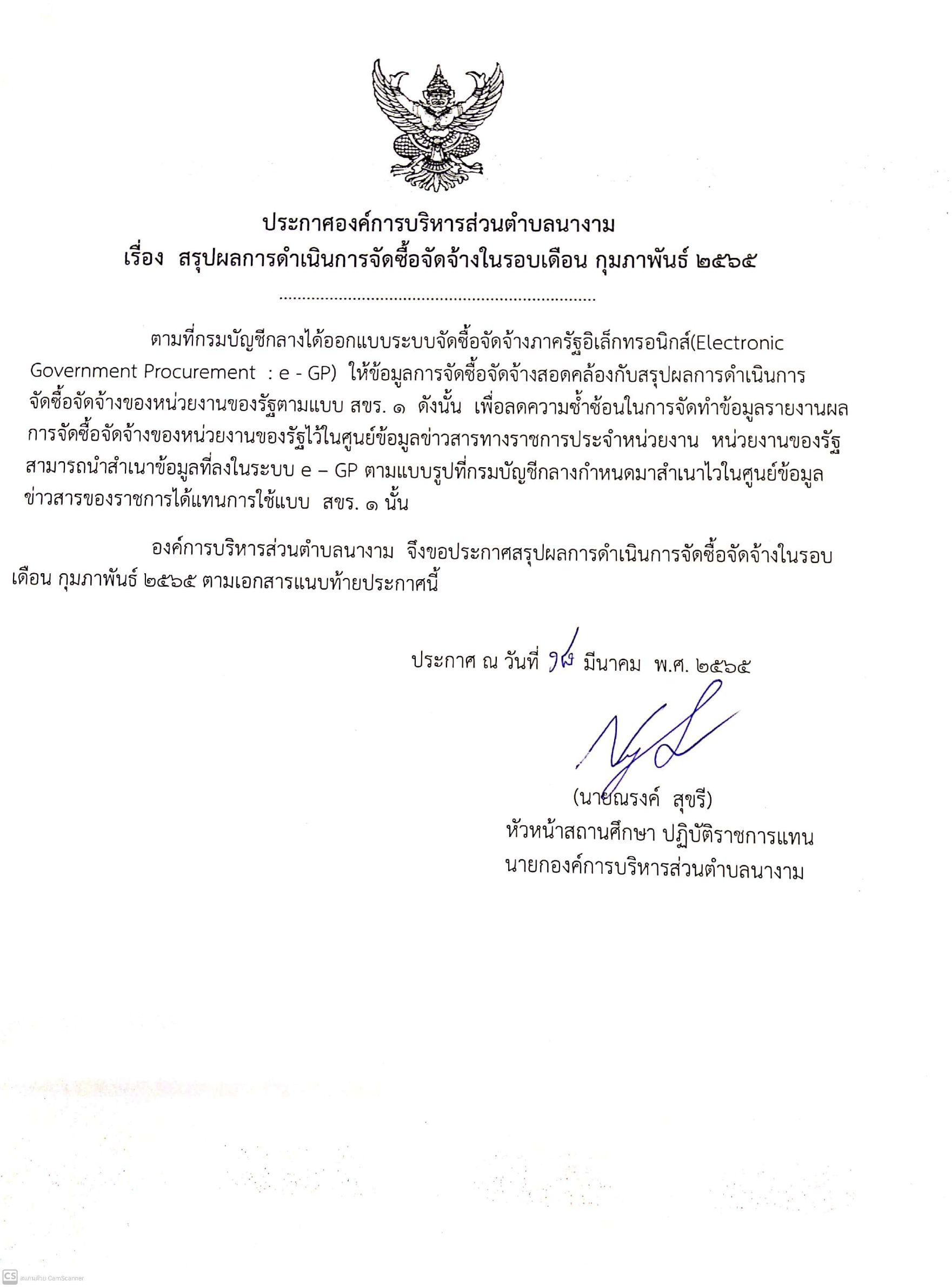 สรุปผลการดำเนินการจัดซื้อจัดจ้างศูนย์พัฒนาเด็กเล็กองค์การบริหารส่วนตำบลนางามเดือน กุมภาพันธ์ 2565