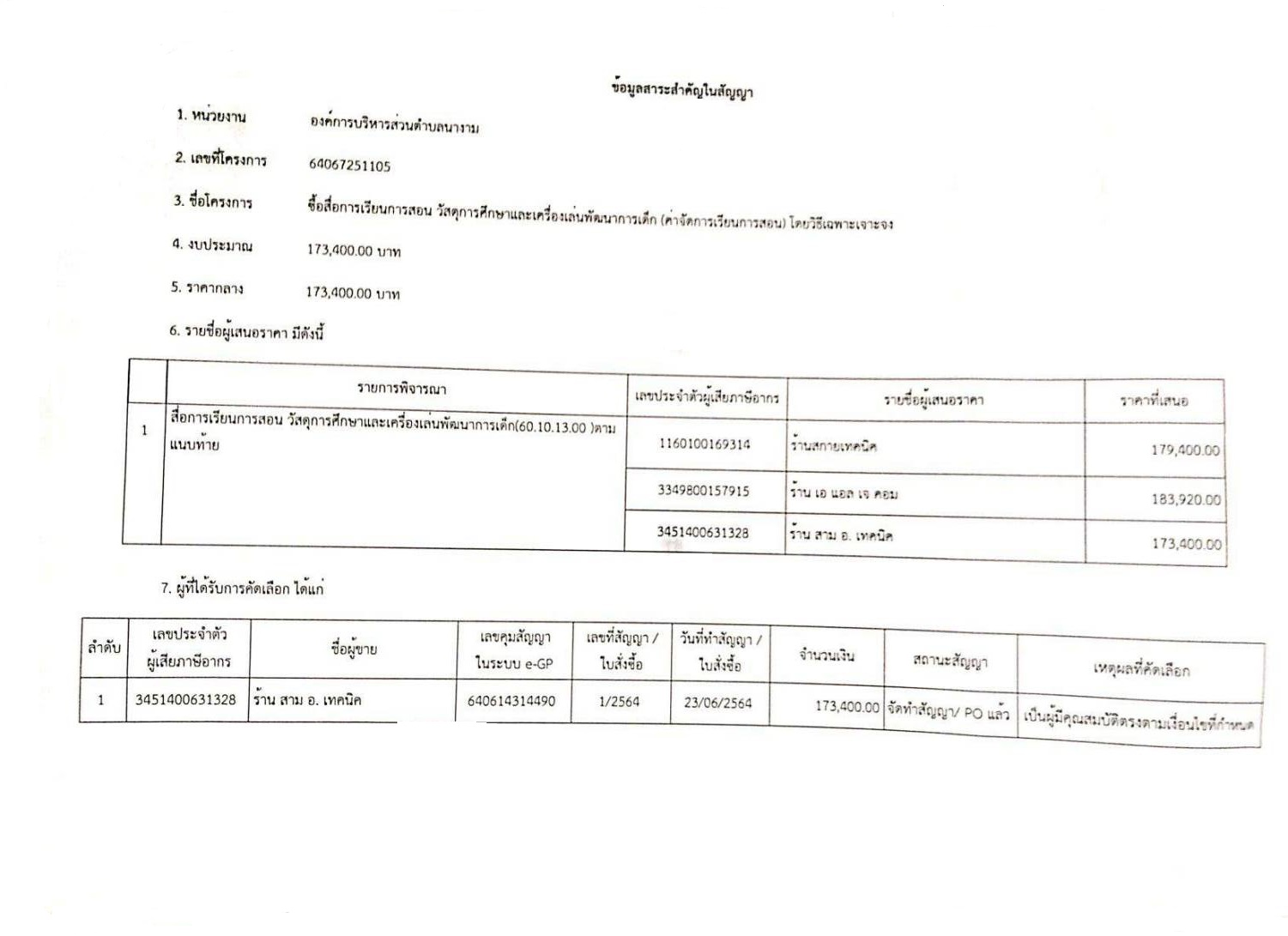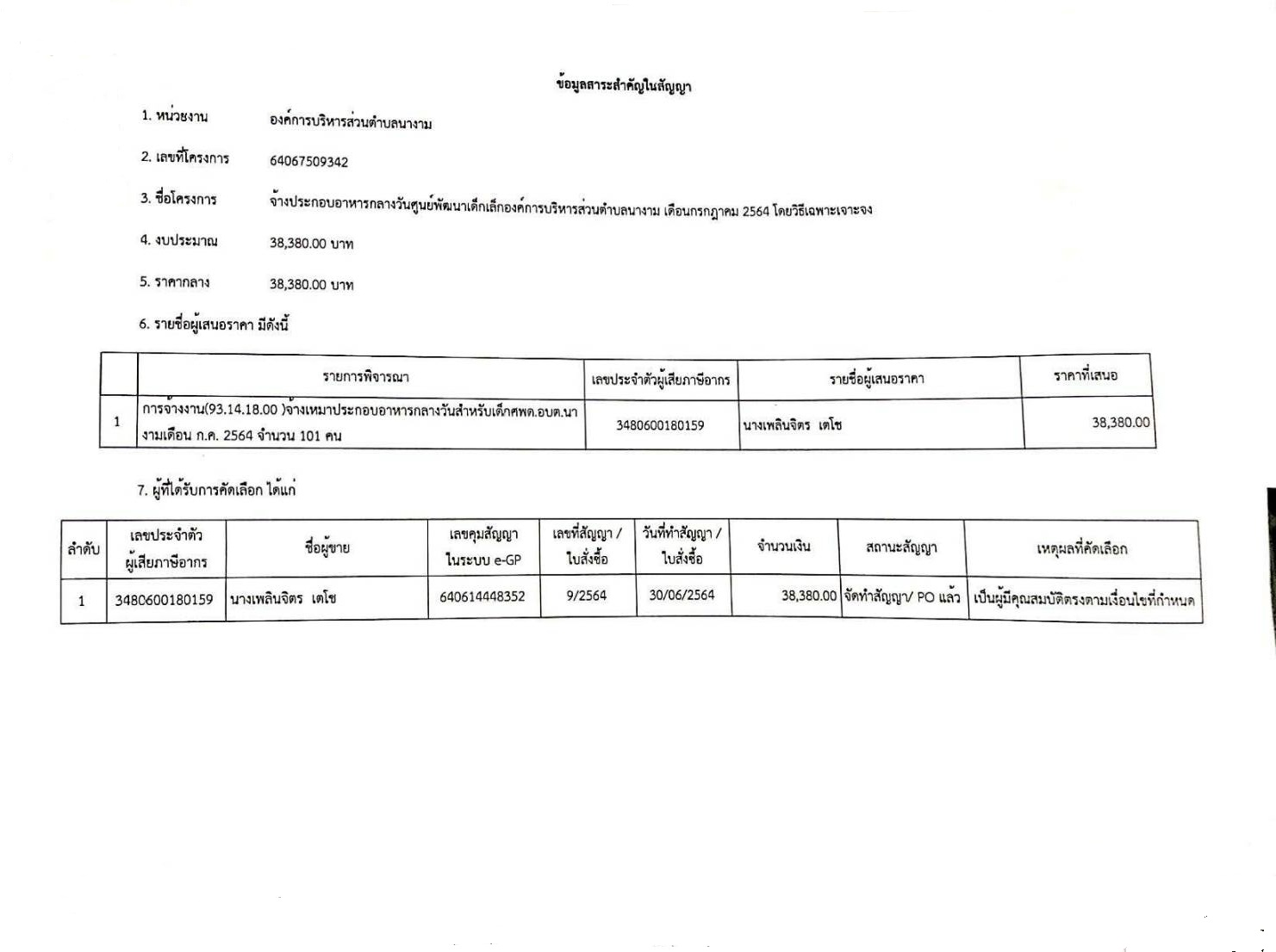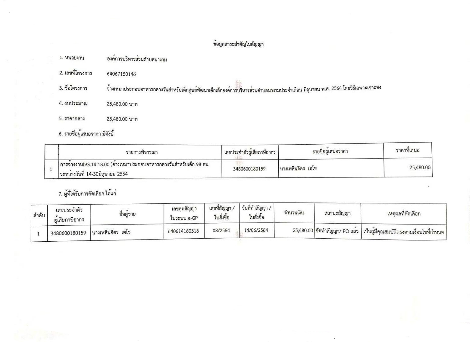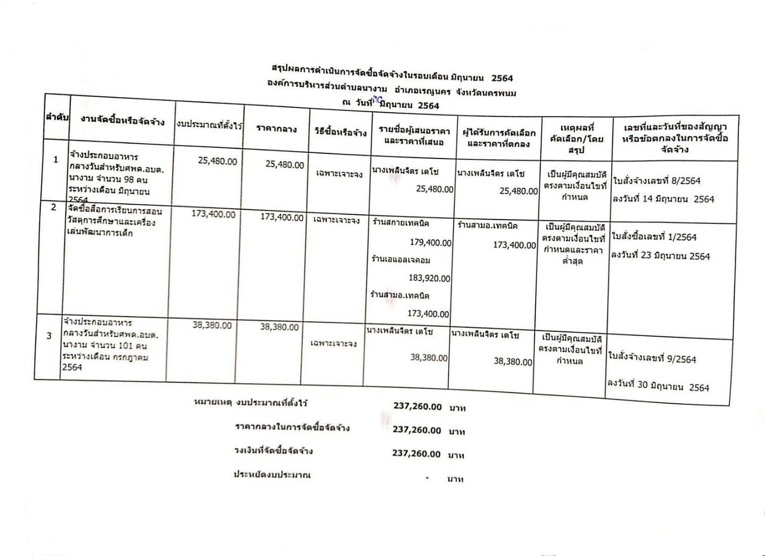 สรุปผลการดำเนินการจัดซื้อจัดจ้างศูนย์พัฒนาเด็กเล็กองค์การบริหารส่วนตำบลนางามเดือน มิถุนายน 2564