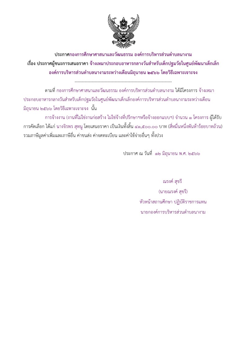 ประกาศผู้ชนะการเสนอราคาจ้างเหมาประกอบอาหารกลางวันเดือนมิถุนายน 2566