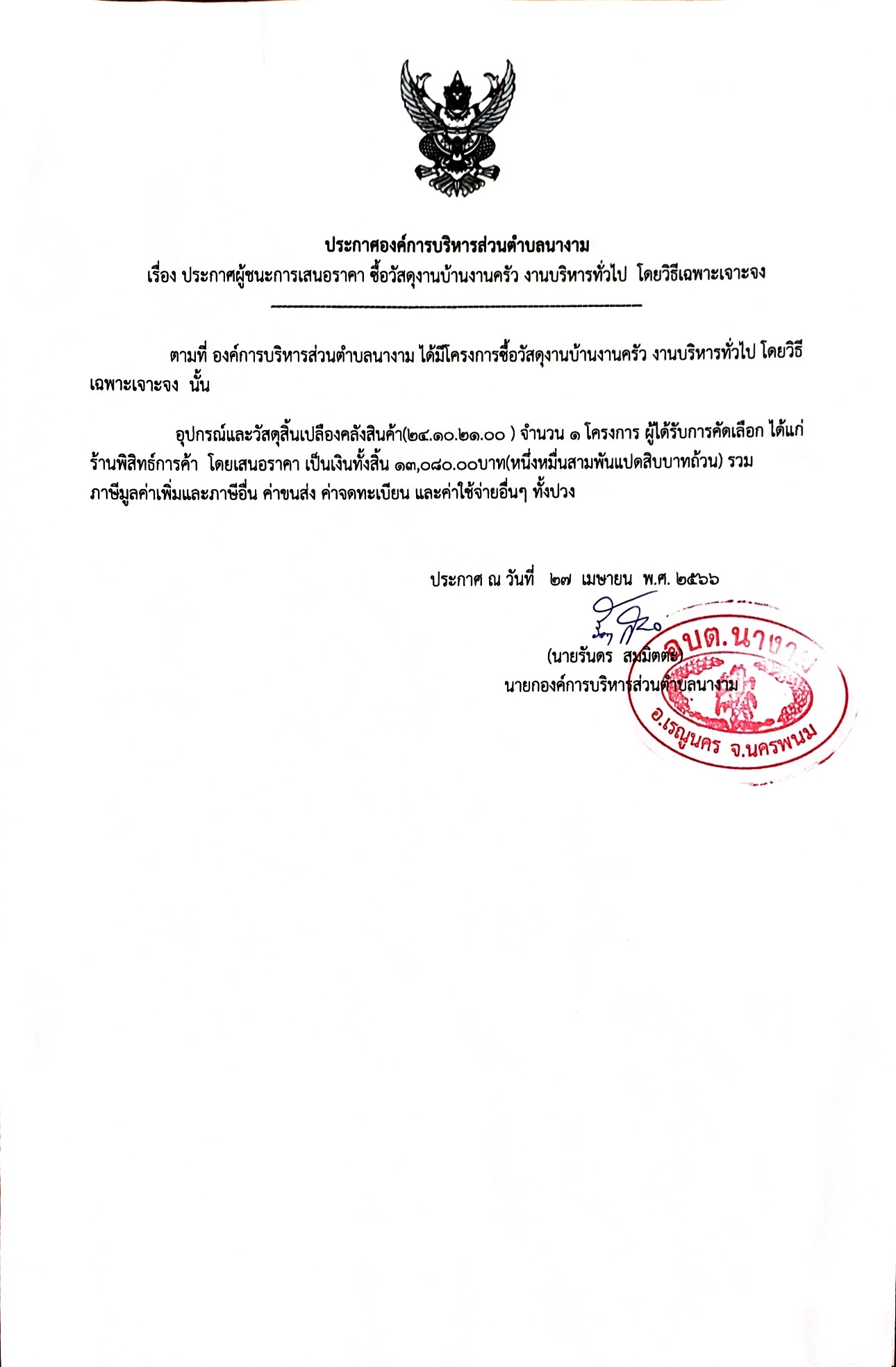 ประกาศผู้ชนะการเสนอราคา ซื้อวัสดุงานบ้านงานครัว งานบริหารทั่วไป โดยวิธีเฉพาะเจาะจง