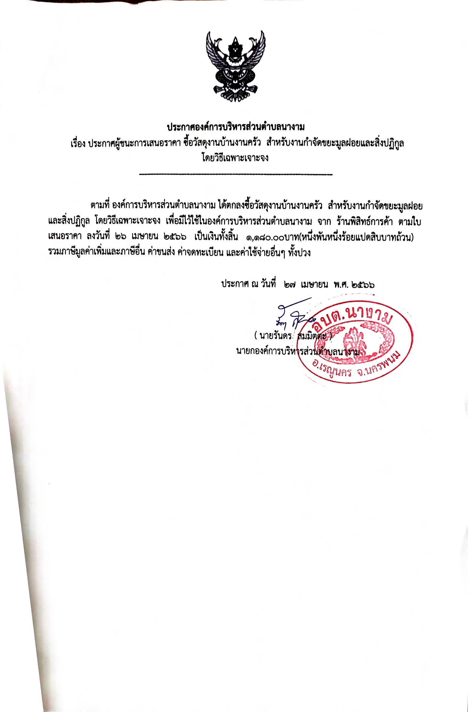 ชื่อเรื่อง : ประกาศผู้ชนะการเสนอราคา ซื้อวัสดุงานบ้านงานครัว สำหรับงานกำจัดขยะมูลฝอยและสิ่งปฏิกูล โดยวิธีเฉพาะเจาะจง