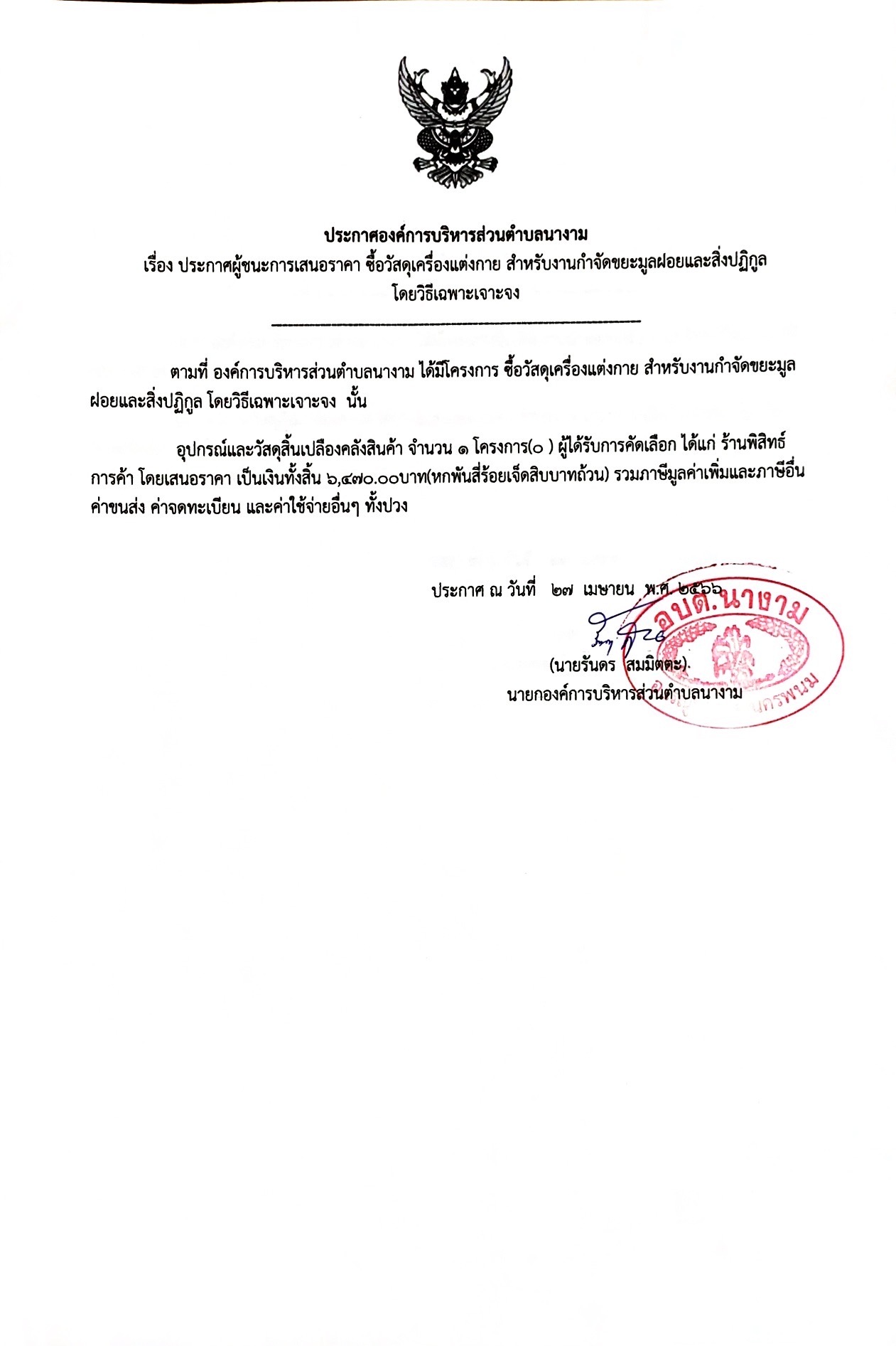 ประกาศผู้ชนะการเสนอราคา ซื้อวัสดุเครื่องแต่งกาย สำหรับงานกำจัดขยะมูลฝอยและสิ่งปฏิกูล โดยวิธีเฉพาะเจาะจง