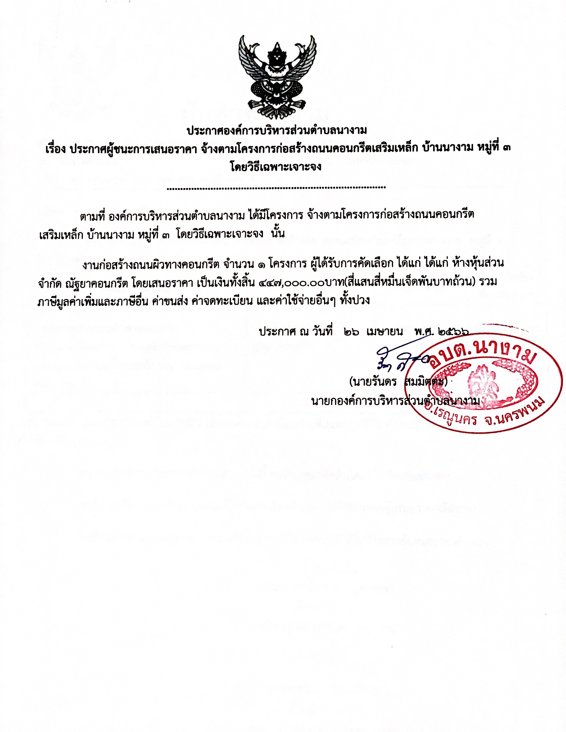 ประกาศผู้ชนะการเสนอราคา จ้างตามโครงการก่อสร้างถนนคอนกรีตเสริมเหล็ก บ้านนางาม หมู่ที่ 3 โดยวิธีเฉพาะเจาะจง