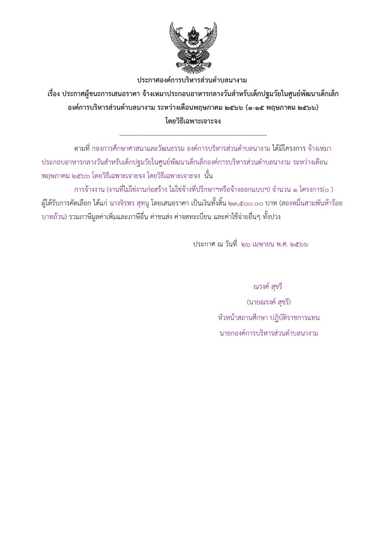 ประกาศผู้ชนะการเสนอราคาจ้างประกอบอาหารกลางวันศูนย์พัฒนาเด็กเล็กองค์การบริหารส่วนตำบลนางามเดือนพฤษภาคม 2565 โดยวิธีเฉพาะเจาะจง
