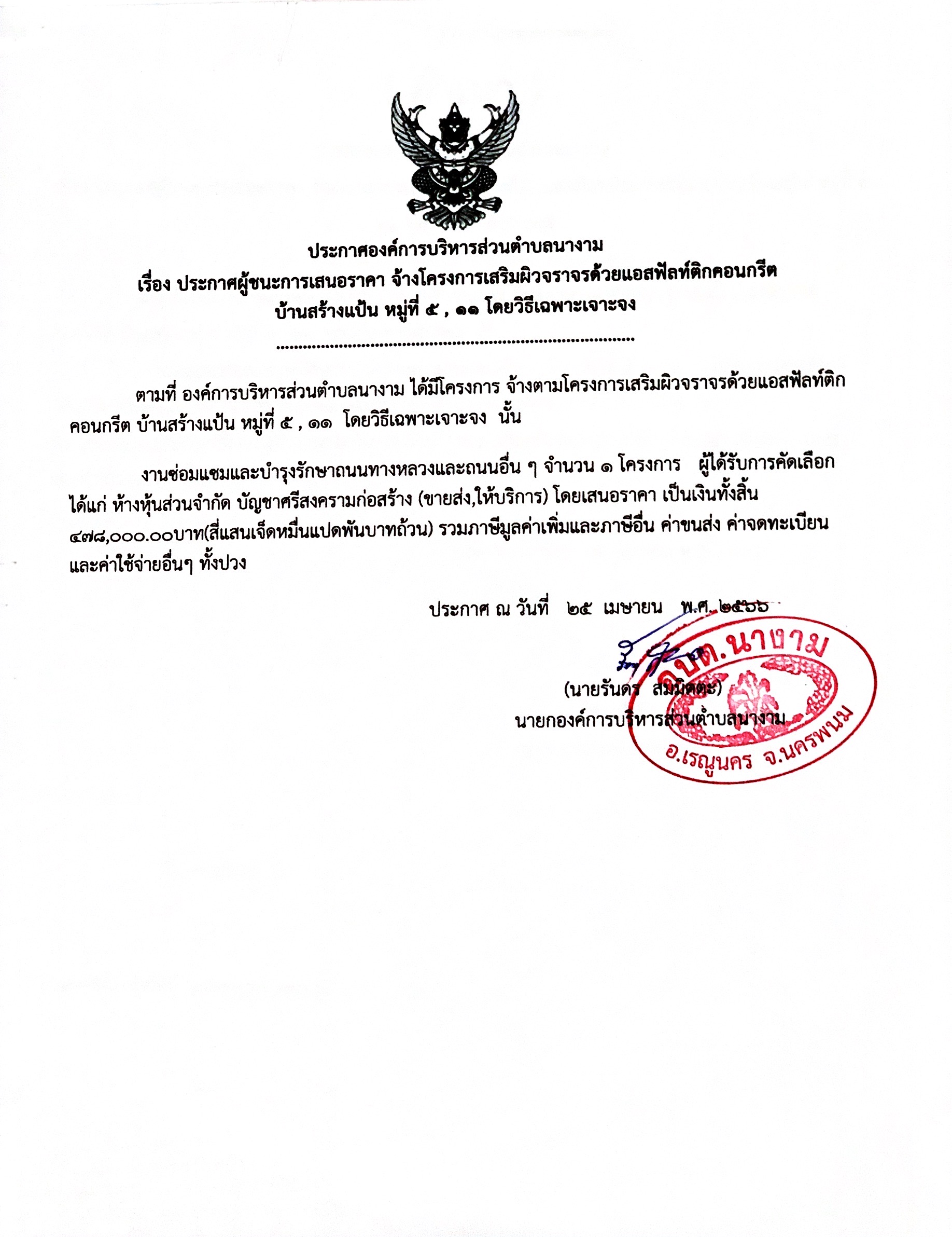 ประกาศผู้ชนะการเสนอราคา จ้างตามโครงการเสริมผิวจราจรด้วยแอสฟัลท์ติกคอนกรีต บ้านสร้างแป้น หมู่ที่ 5 , 11 โดยวิธีเฉพาะเจาะจง