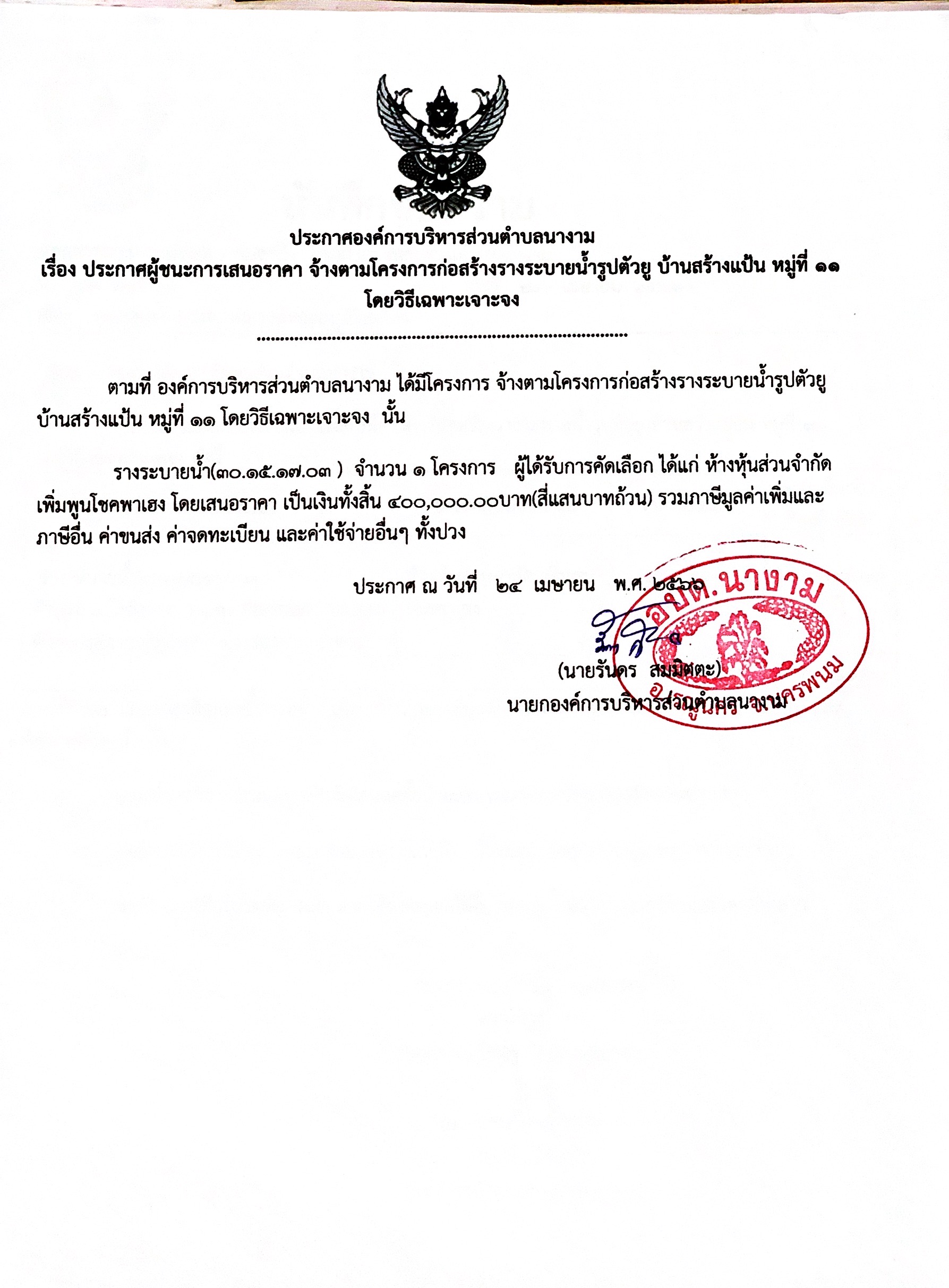 ชื่อเรื่อง : ประกาศผู้ชนะการเสนอราคา จ้างตามโครงการก่อสร้างรางระบายน้ำรูปตัวยู บ้านสร้างแป้น หมู่ที่ 11 โดยวิธีเฉพาะเจาะจง