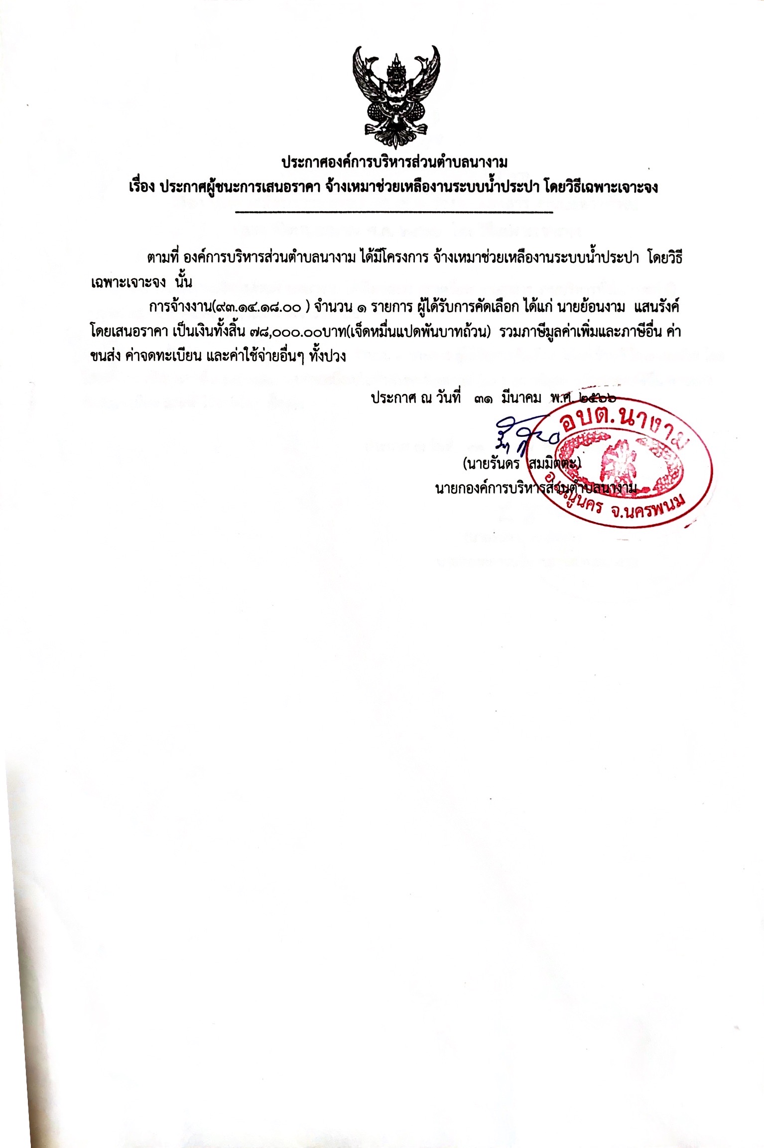 ประกาศผู้ชนะการเสนอราคา จ้างเหมาช่วยเหลืองานระบบน้ำประปา โดยวิธีเฉพาะเจาะจง