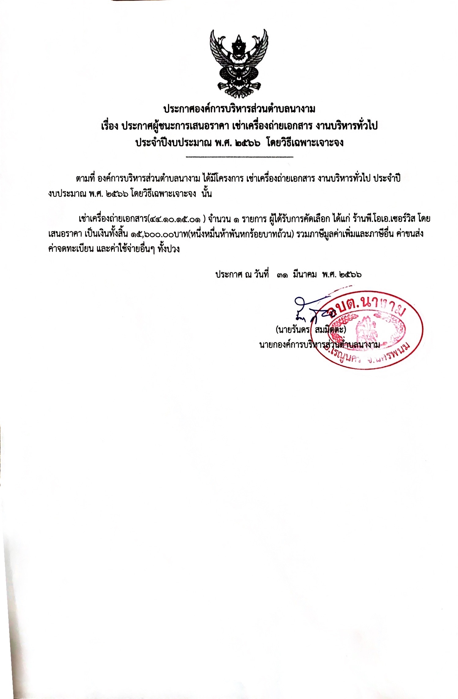 ประกาศผู้ชนะการเสนอราคา เช่าเครื่องถ่ายเอกสาร งานบริหารทั่วไป ประจำปีงบประมาณ พ.ศ. ๒๕๖๖ โดยวิธีเฉพาะเจาะจง