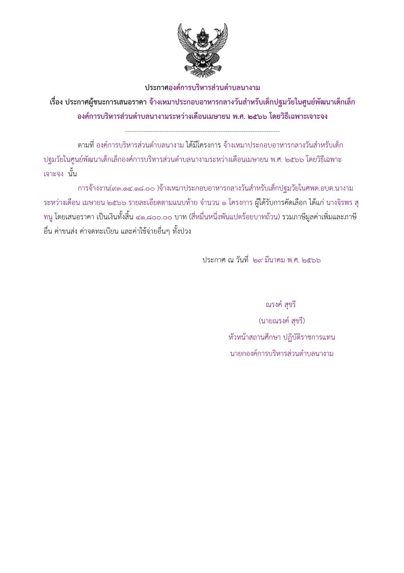 ประกาศผู้ชนะการเสนอราคาจ้างประกอบอาหารกลางวันศูนย์พัฒนาเด็กเล็กองค์การบริหารส่วนตำบลนางามเดือนเมษายน2566
