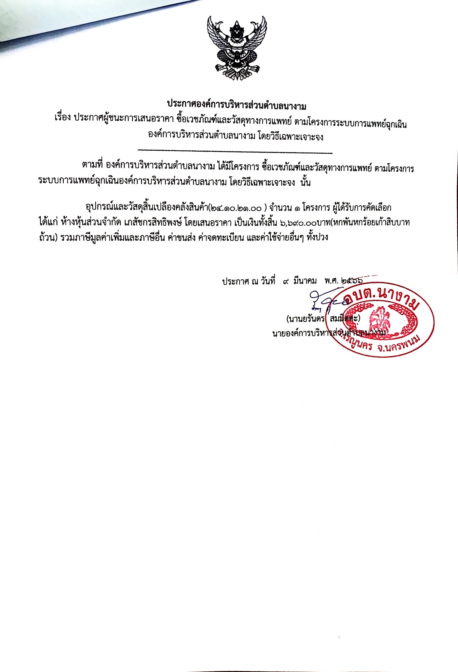 ประกาศผู้ชนะการเสนอราคา ซื้อเวชภัณฑ์และวัสดุทางการแพทย์ ตามโครงการระบบการแพทย์ฉุกเฉินองค์การบริหารส่วนตำบลนางาม โดยวิธีเฉพาะเจาะจง