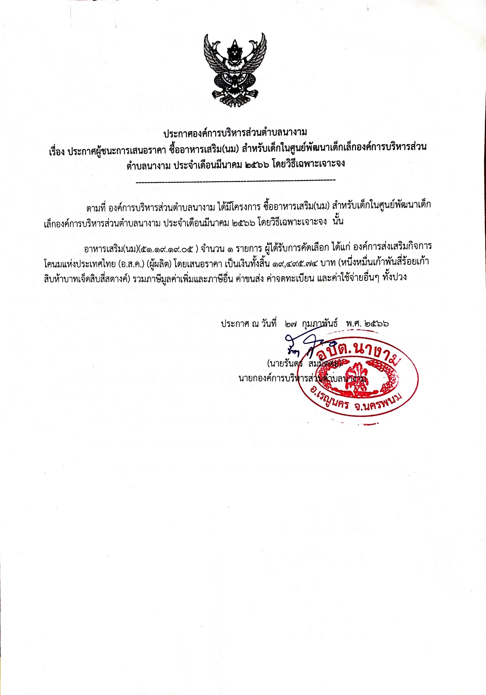 ประกาศผู้ชนะการเสนอราคา ซื้ออาหารเสริม(นม) สำหรับเด็กในศูนย์พัฒนาเด็กเล็กองค์การบริหารส่วนตำบลนางาม ประจำเดือนมีนาคม ๒๕๖๖ โดยวิธีเฉพาะเจาะจง