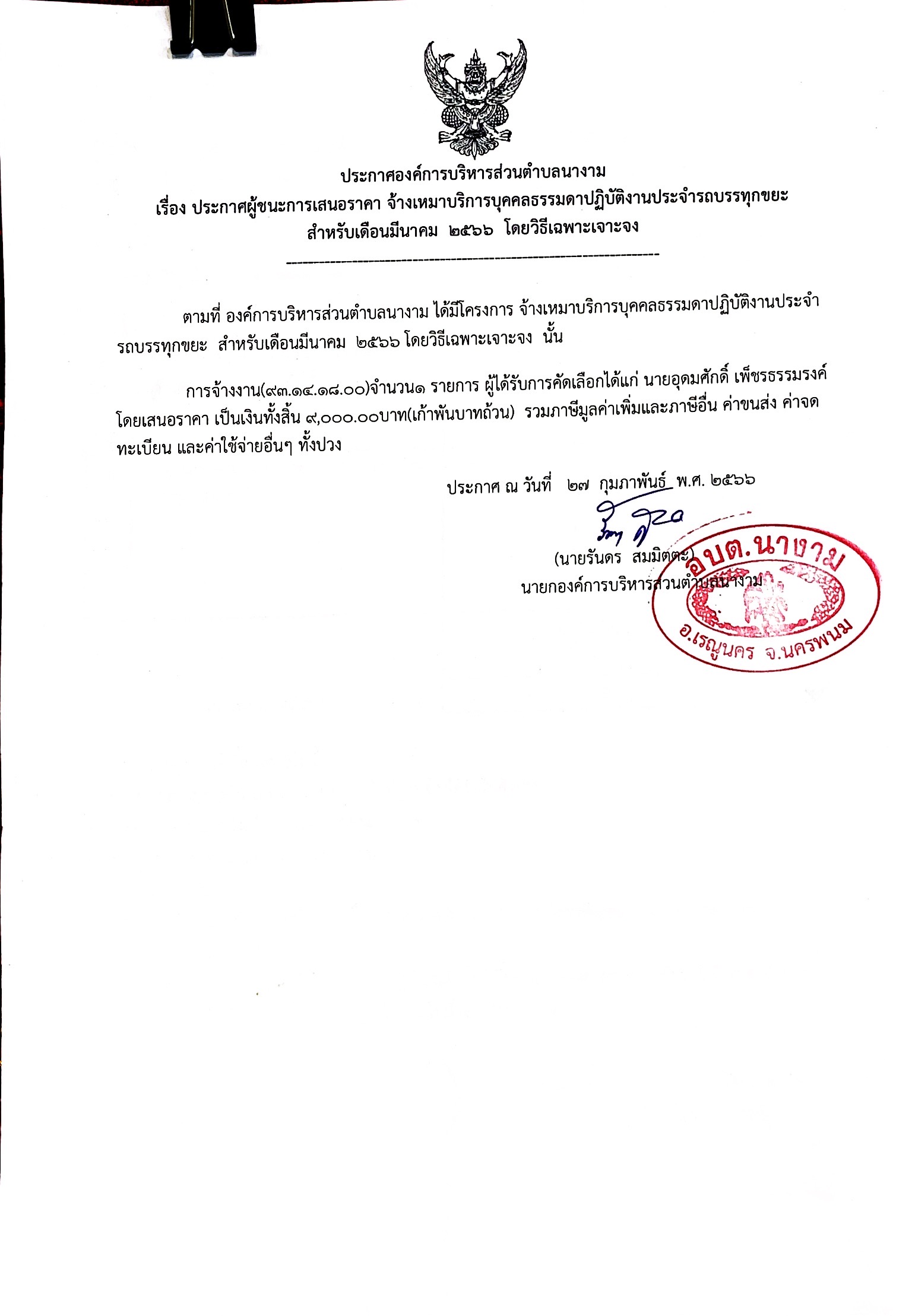 ประกาศผู้ชนะการเสนอราคา จ้างเหมาบริการบุคคลธรรมดาปฏิบัติงานประจำรถบรรทุกขยะ สำหรับเดือนมีนาคม ๒๕๖๖ โดยวิธีเฉพาะเจาะจง