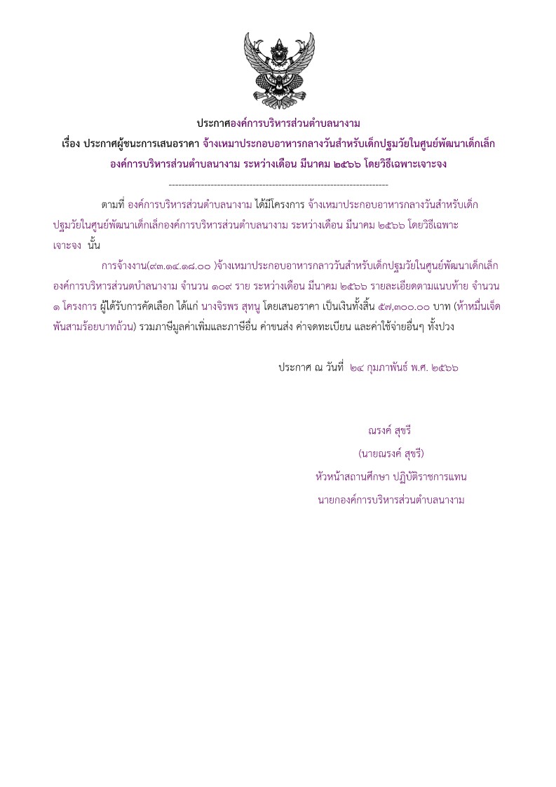 ประกาศผู้ชนะการเสนอราคาจ้างประกอบอาหารกลางวันศูนย์พัฒนาเด็กเล็กองค์การบริหารส่วนตำบลนางามเดือน มีนาคม 2566 โดยวิธีเฉพาะเจาะจง