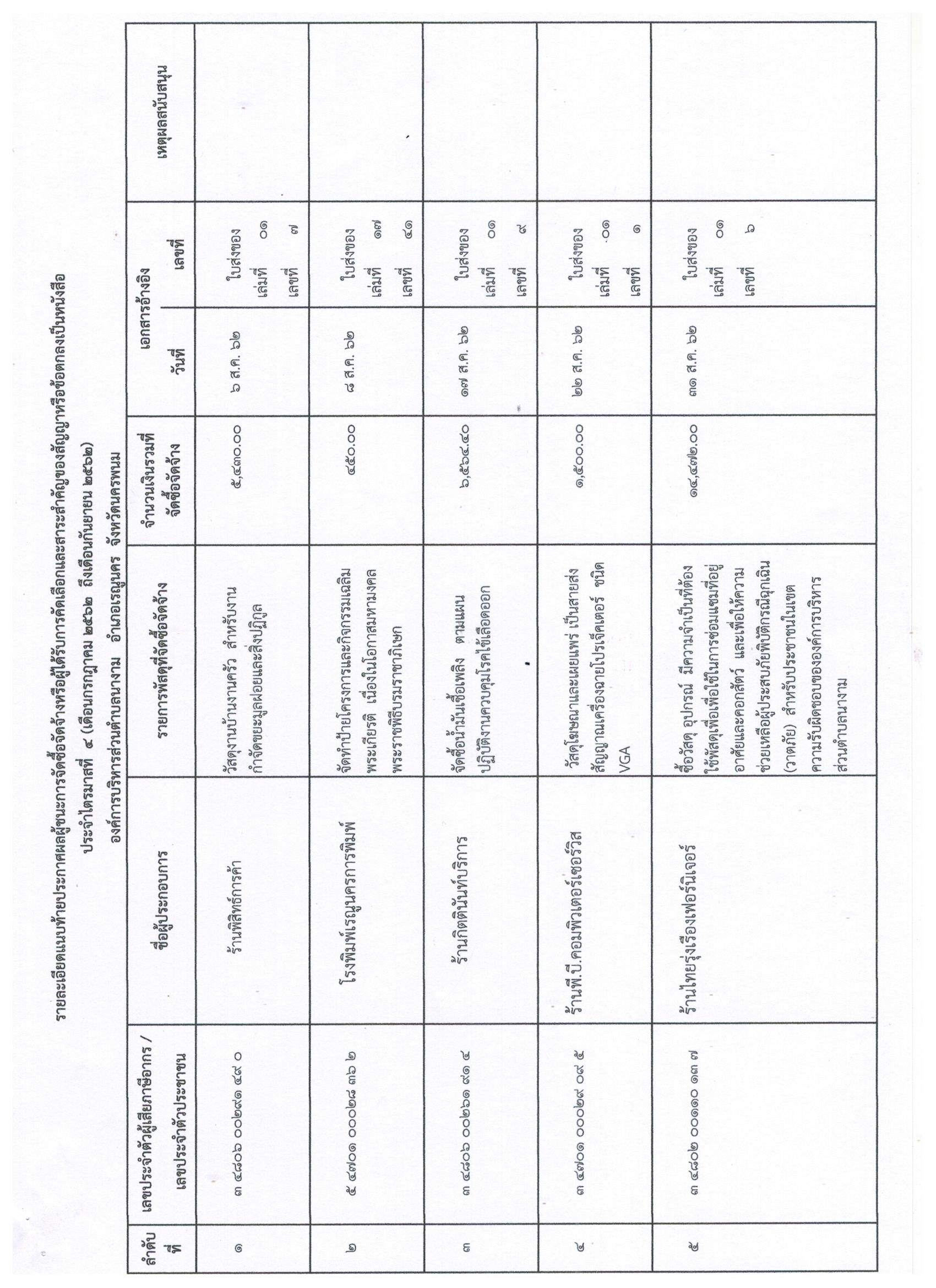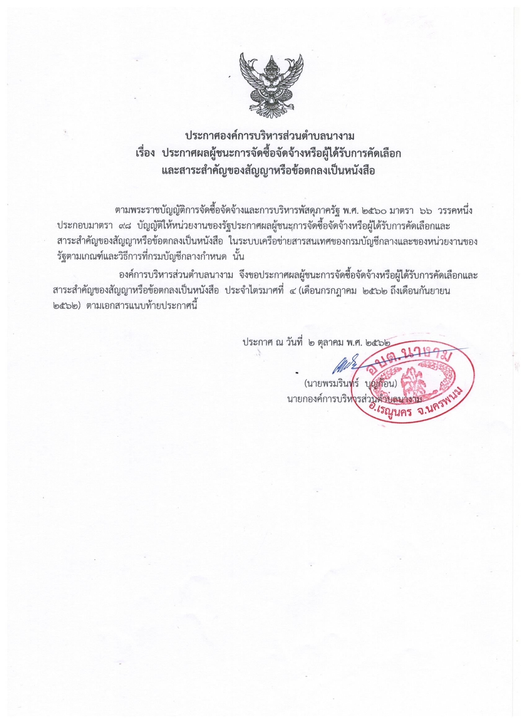 รายละเอียดแนบท้ายประกาศผลผู้ชนะการจัดซื้อจัดจ้างหรือผู้ได้รับการคัดเลือกและสาระสำคัญของสัญญาหรือข้อตกลงเป็นหนังสือ ปี 2562 ไตรมาสที่ 4