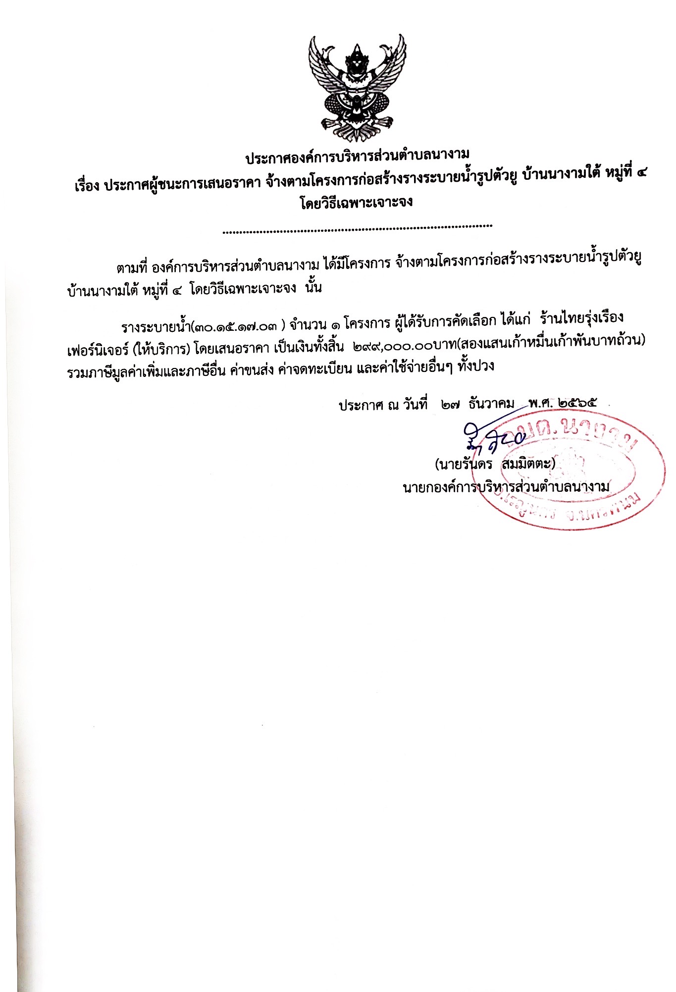 ประกาศผู้ชนะการเสนอราคา จ้างตามโครงการก่อสร้างรางระบายน้ำรูปตัวยู บ้านนางามใต้ หมู่ที่ 4 โดยวิธีเฉพาะเจาะจง