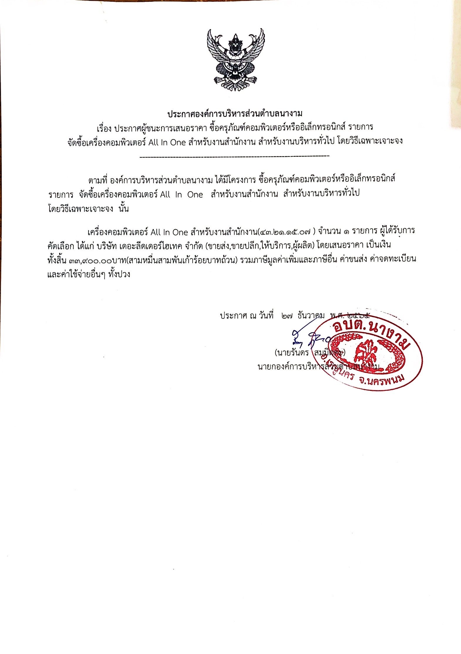 ชื่อเรื่อง : ประกาศผู้ชนะการเสนอราคา ซื้อครุภัณฑ์คอมพิวเตอร์หรืออิเล็กทรอนิกส์ รายการ จัดซื้อเครื่องคอมพิวเตอร์ All In One สำหรับงานสำนักงาน สำหรับงานบริหารทั่วไป โดยวิธีเฉพาะเจาะจง