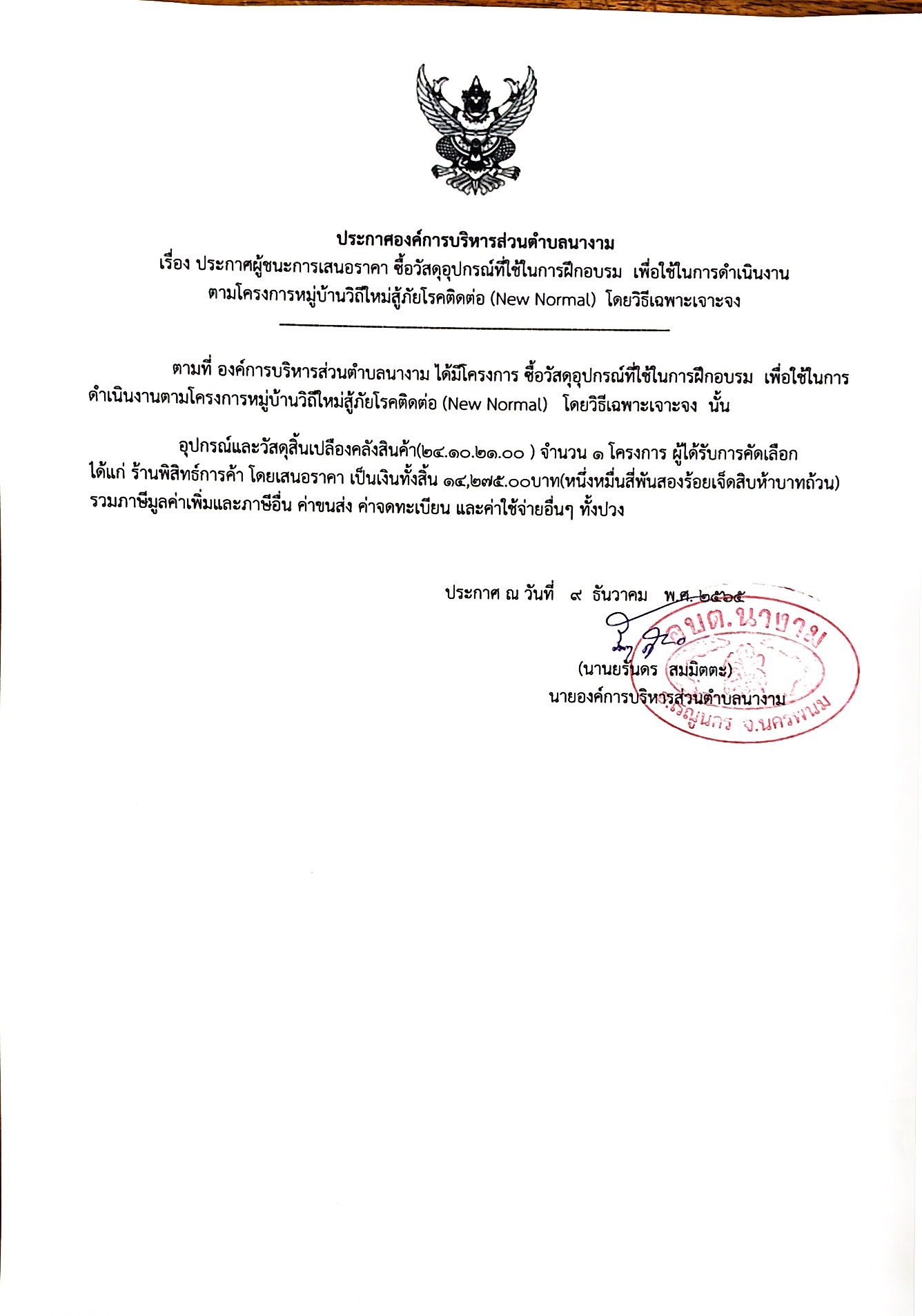 ประกาศผู้ชนะการเสนอราคา ซื้อวัสดุอุปกรณ์ที่ใช้ในการฝึกอบรม เพื่อใช้ในการดำเนินงาน ตามโครงการหมู่บ้านวิถีใหม่สู้ภัยโรคติดต่อ (New Normal) โดยวิธีเฉพาะเจาะจง