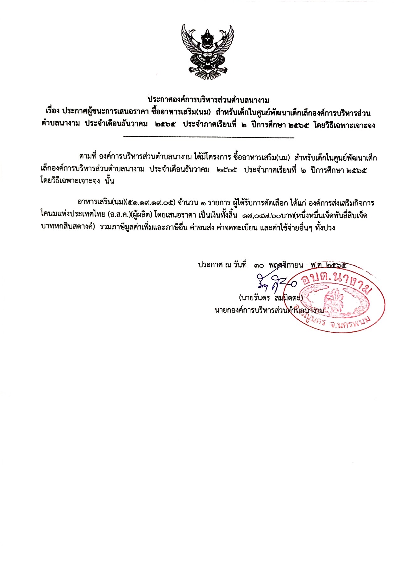 ชื่อเรื่อง : ประกาศผู้ชนะการเสนอราคา ซื้ออาหารเสริม(นม) สำหรับเด็กในศูนย์พัฒนาเด็กเล็กองค์การบริหารส่วนตำบลนางาม ประจำเดือนธันวาคม ๒๕๖๕ ประจำภาคเรียนที่ 2 ปีการศึกษา ๒๕๖๕ โดยวิธีเฉพาะเจาะจง