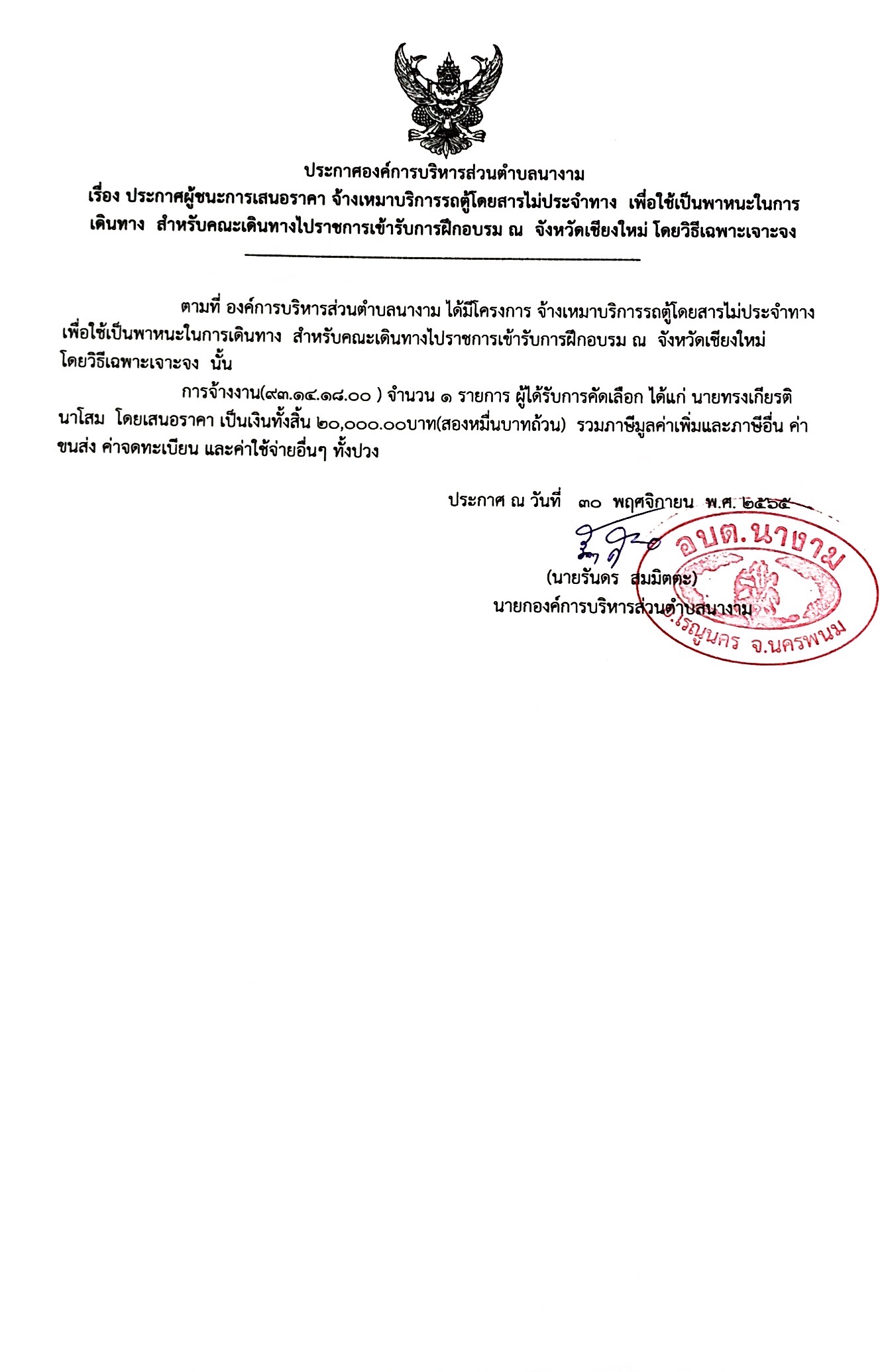 ชื่อเรื่อง : ประกาศผู้ชนะการเสนอราคา จ้างเหมาบริการรถตู้โดยสารไม่ประจำทาง เพื่อใช้เป็นพาหนะในการเดินทาง สำหรับคณะเดินทางไปราชการเข้ารับการฝึกอบรม ณ จังหวัดเชียงใหม่ โดยวิธีเฉพาะเจาะจง